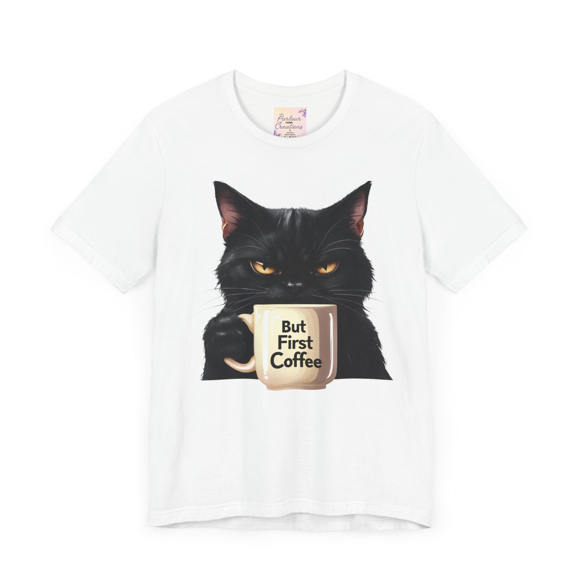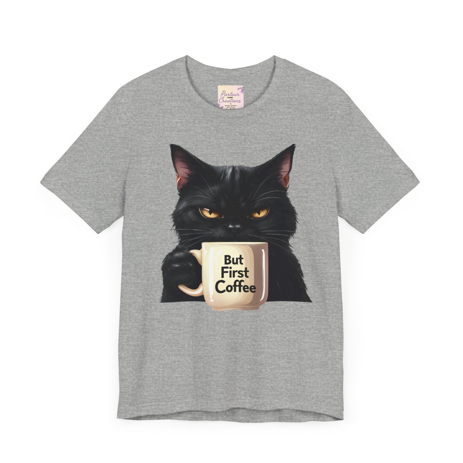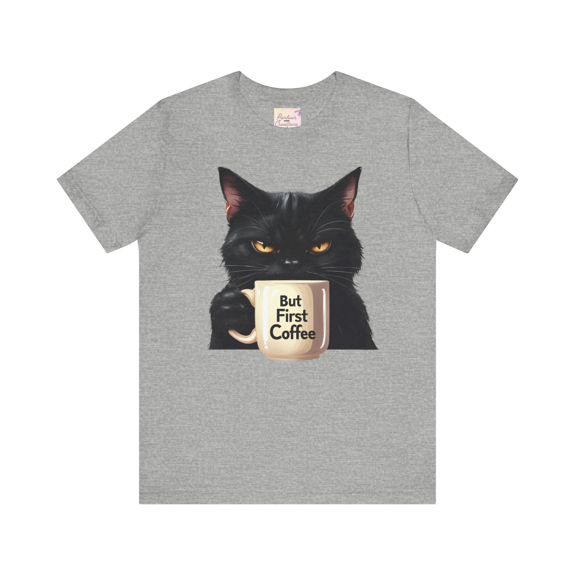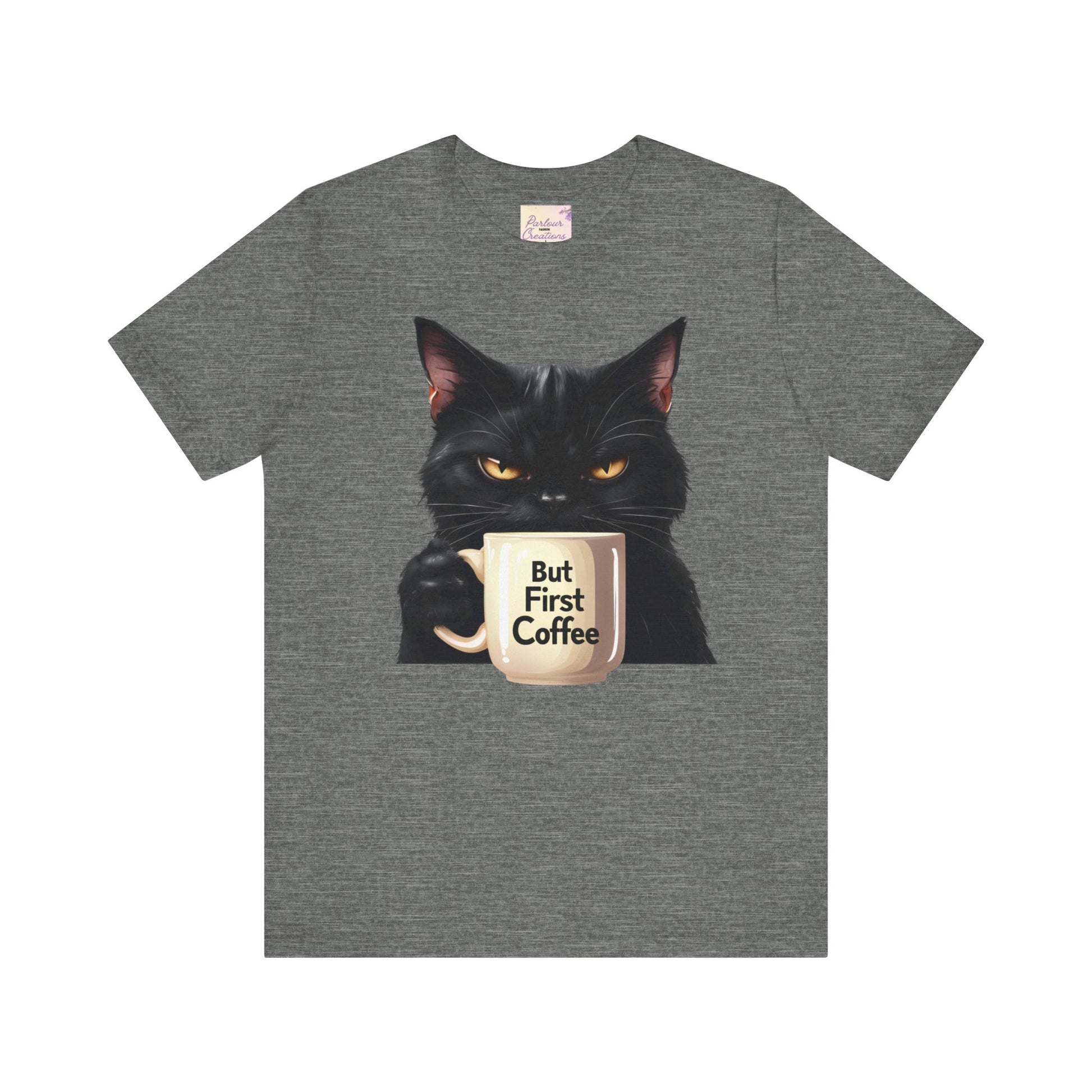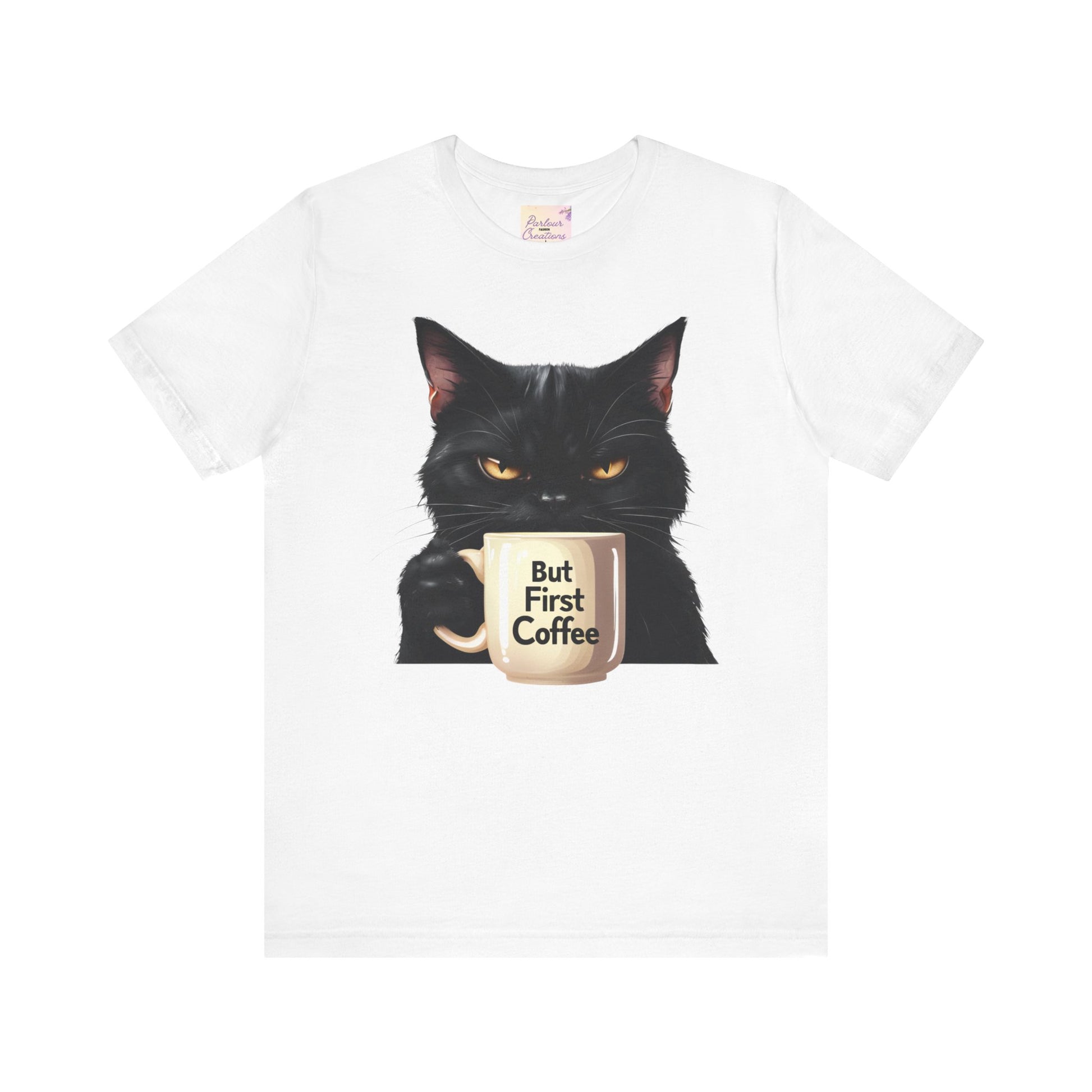 "But First Coffee" Cute Cat Unisex Tee - Fun T-Shirt for Cat Lovers, Perfect Gift, Casual Wear, Coffee Enthusiast, Birthday, Holidays