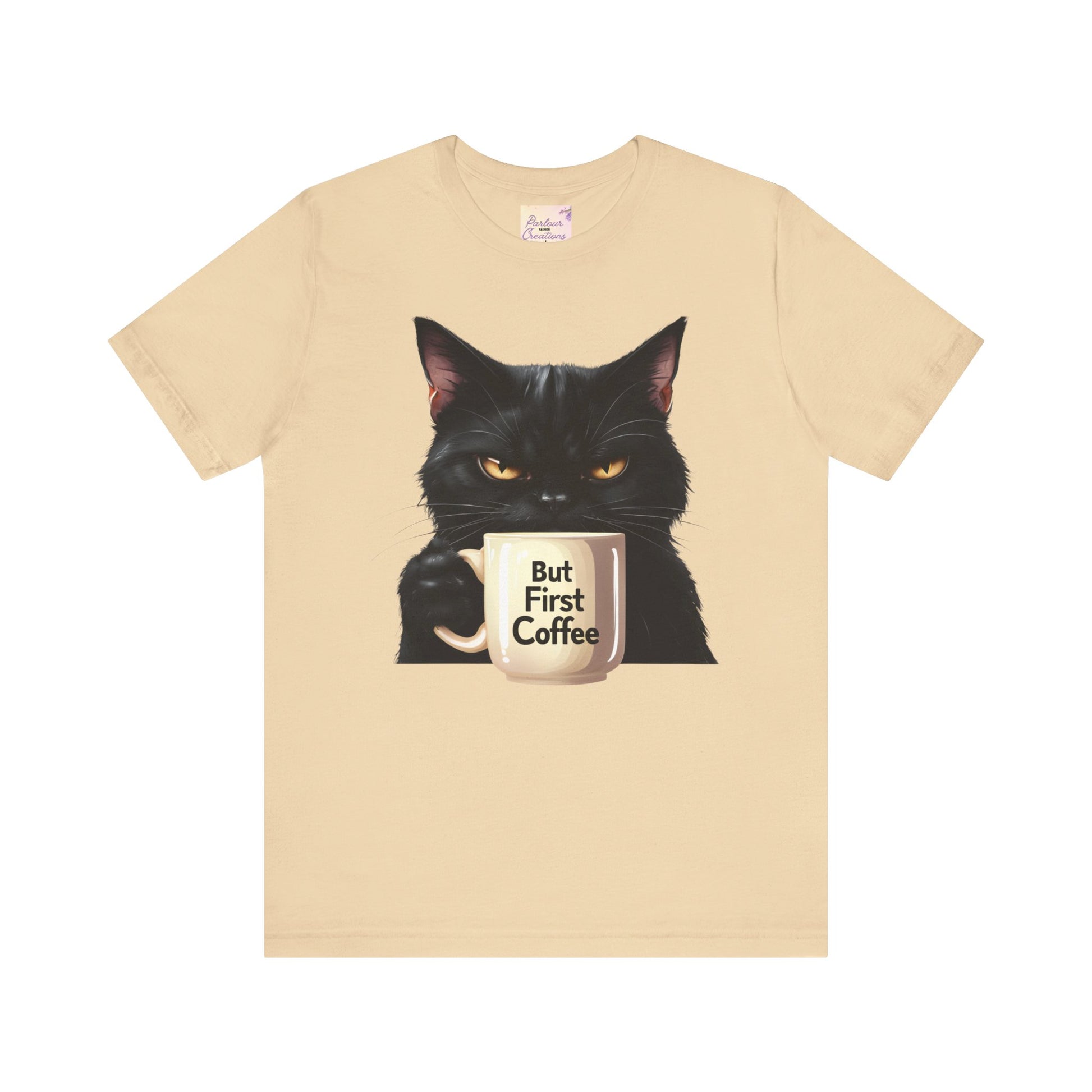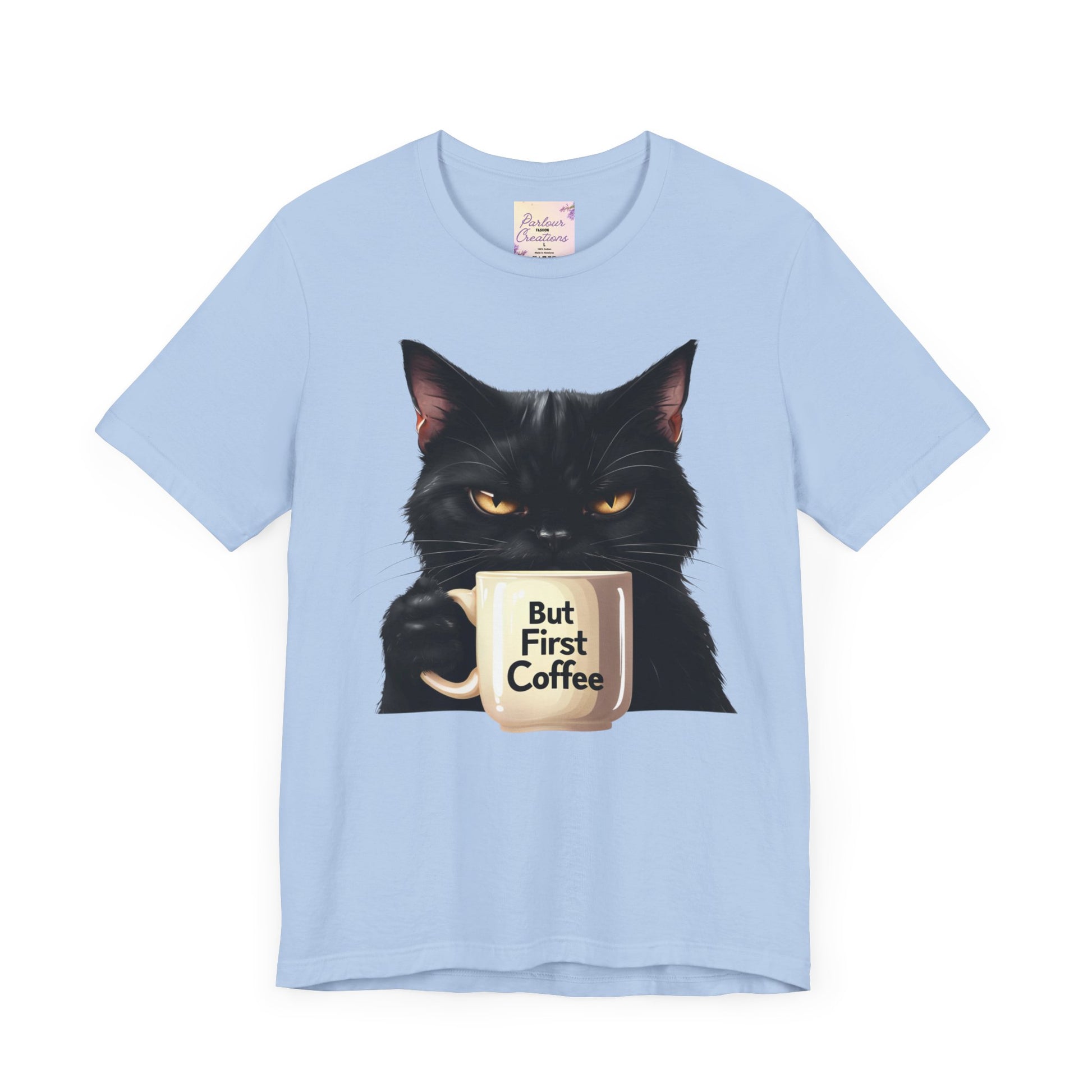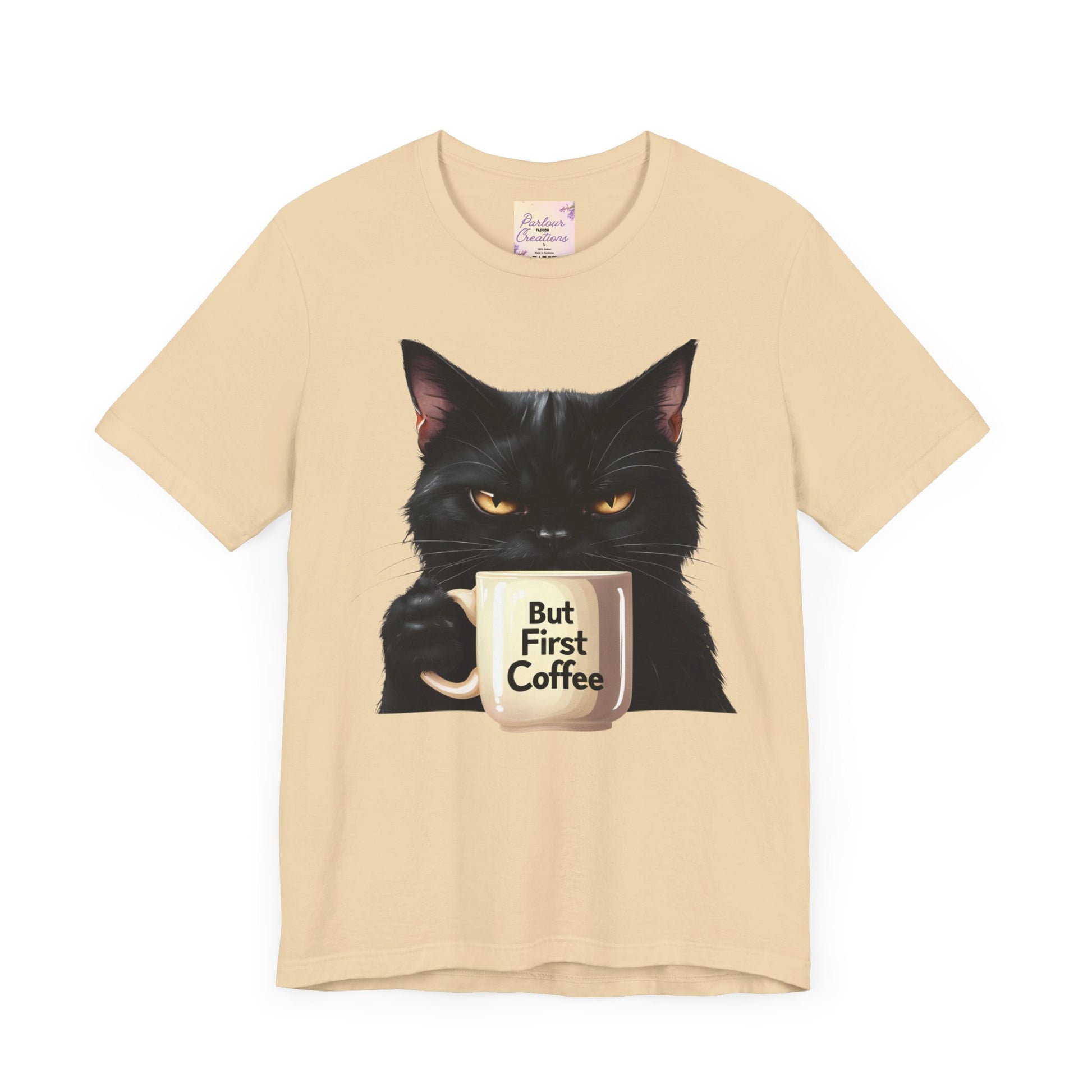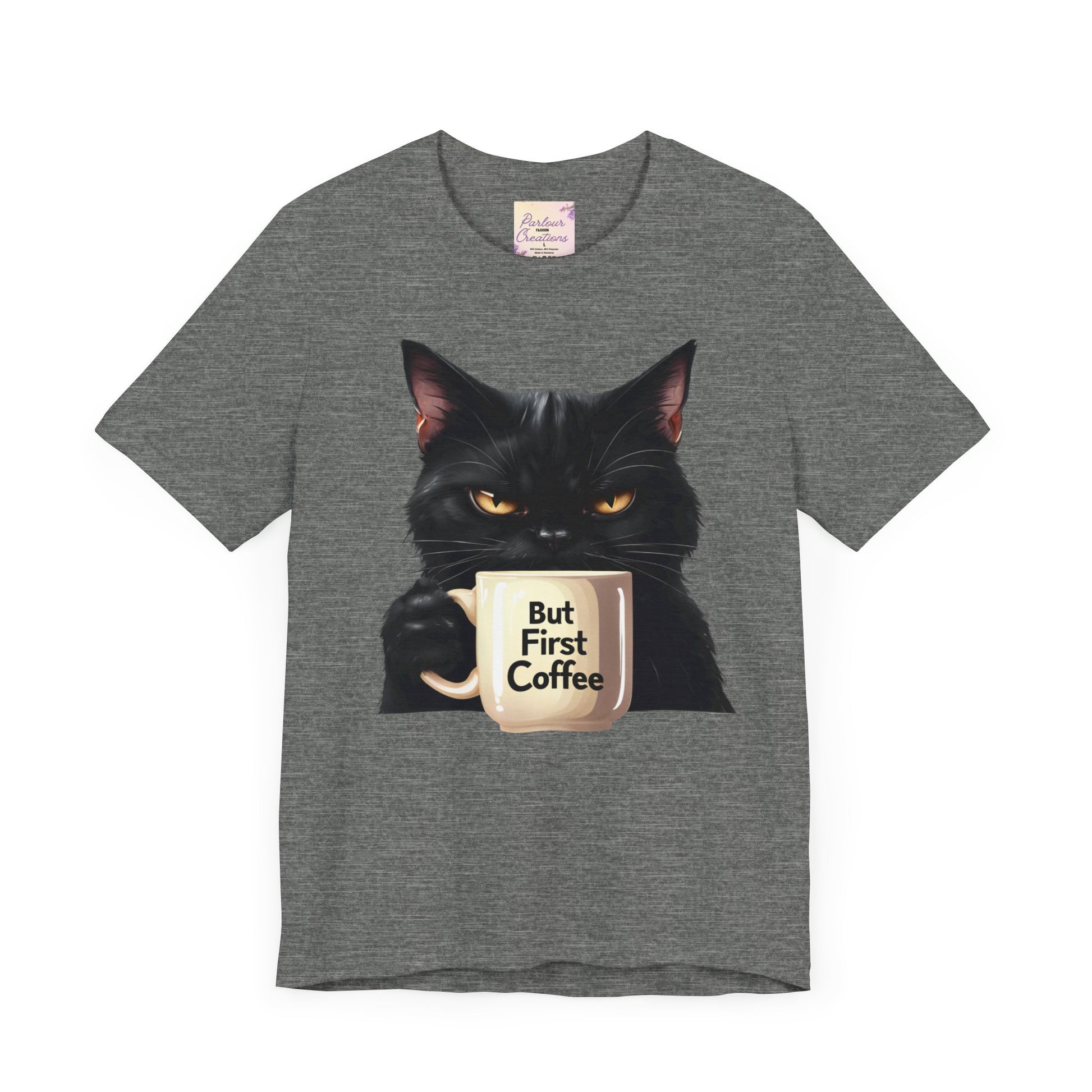 "But First Coffee" Cute Cat Unisex Tee - Fun T-Shirt for Cat Lovers, Perfect Gift, Casual Wear, Coffee Enthusiast, Birthday, Holidays