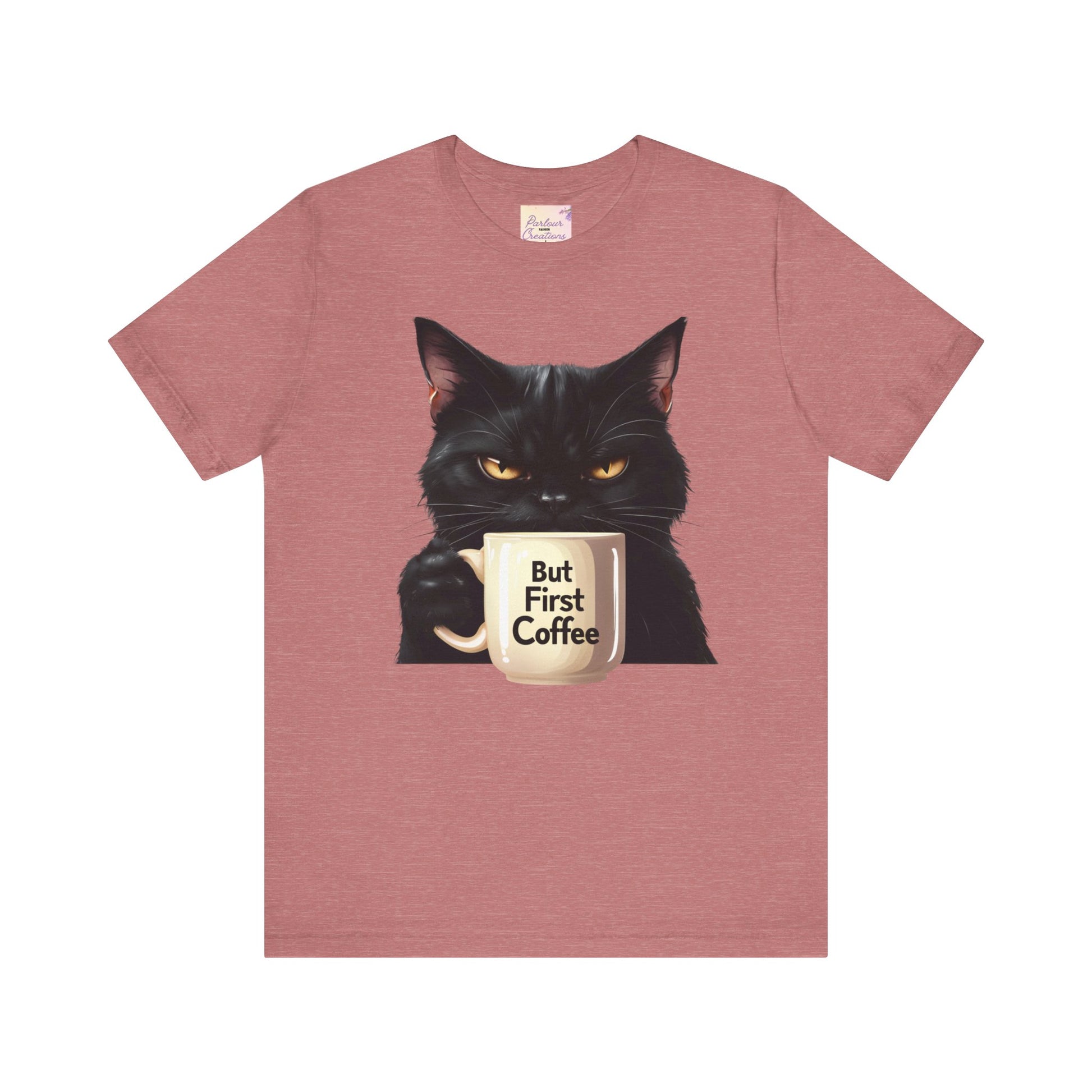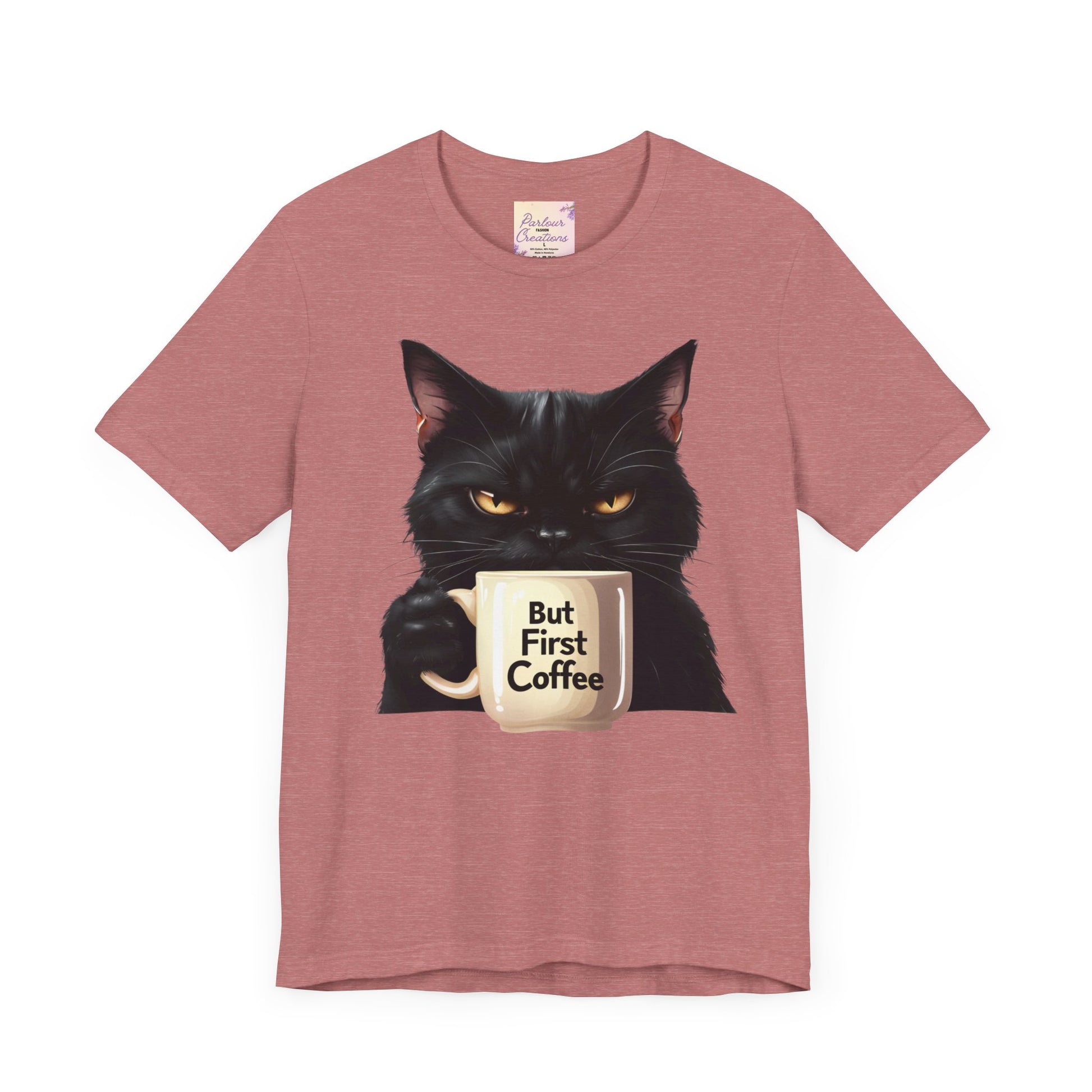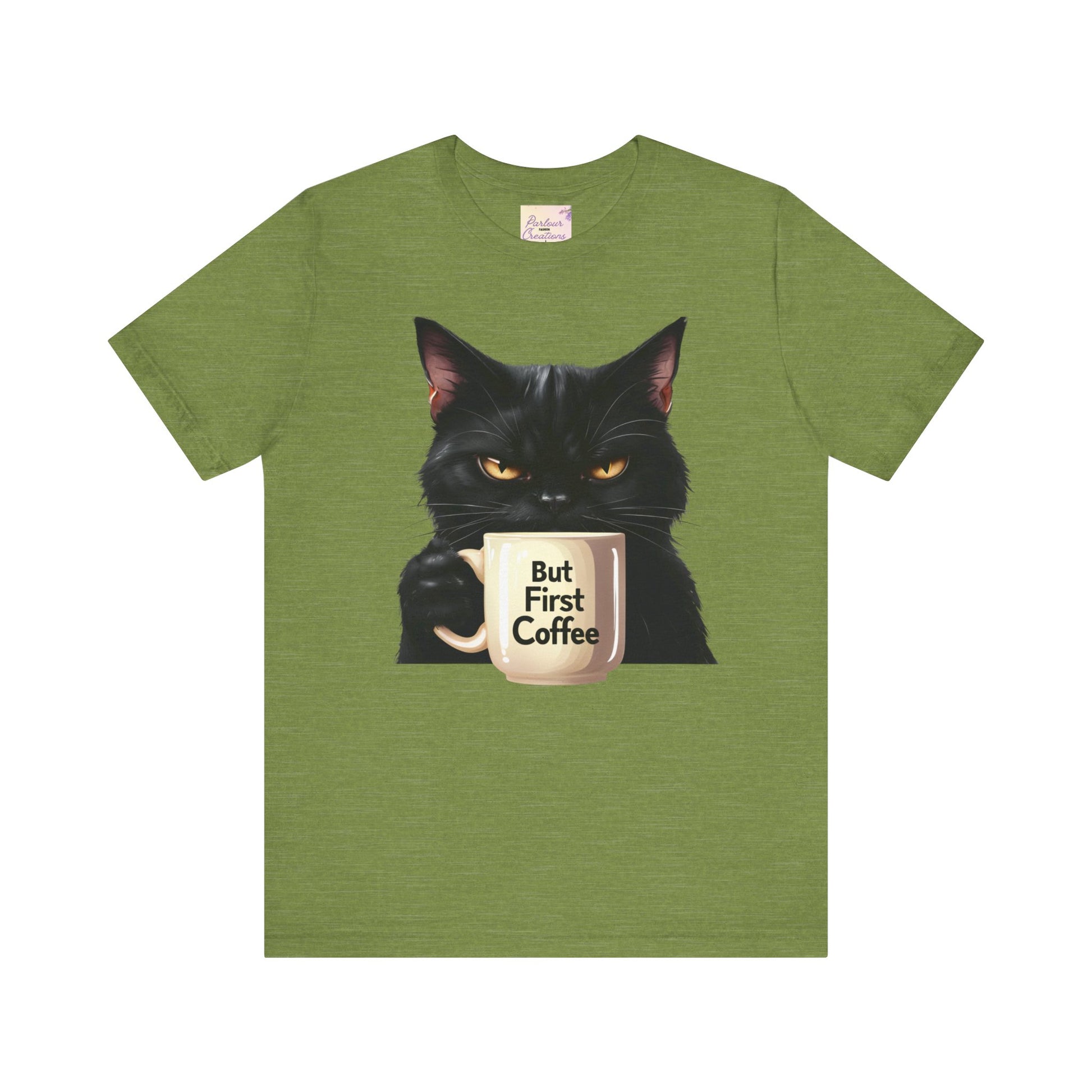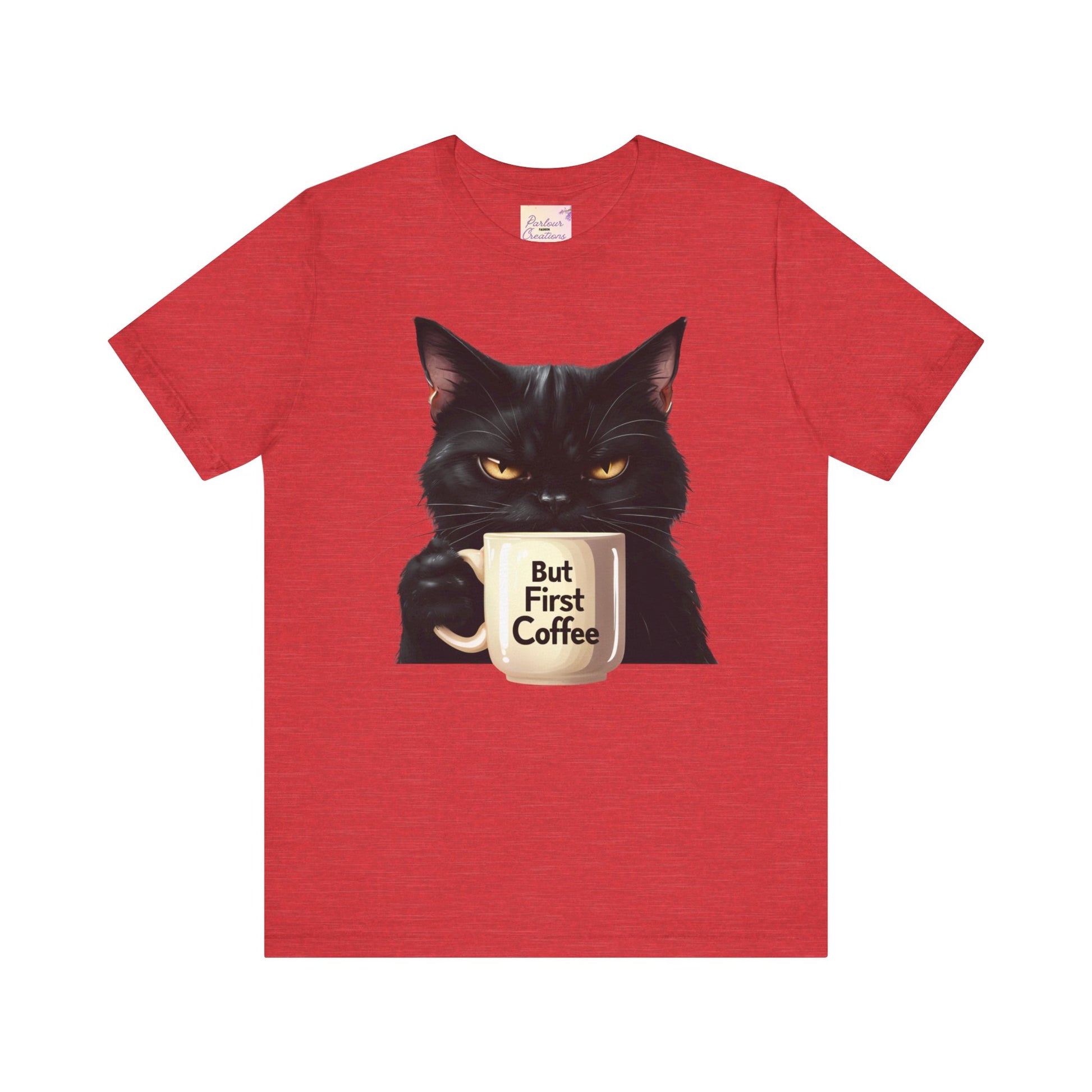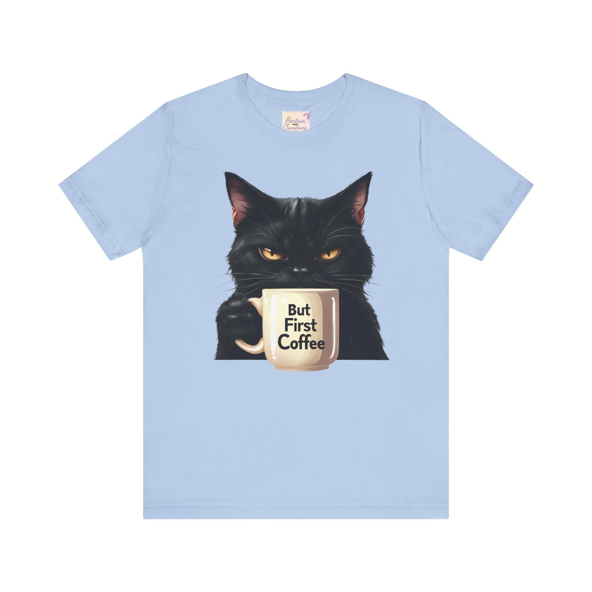 "But First Coffee" Cute Cat Unisex Tee - Fun T-Shirt for Cat Lovers, Perfect Gift, Casual Wear, Coffee Enthusiast, Birthday, Holidays