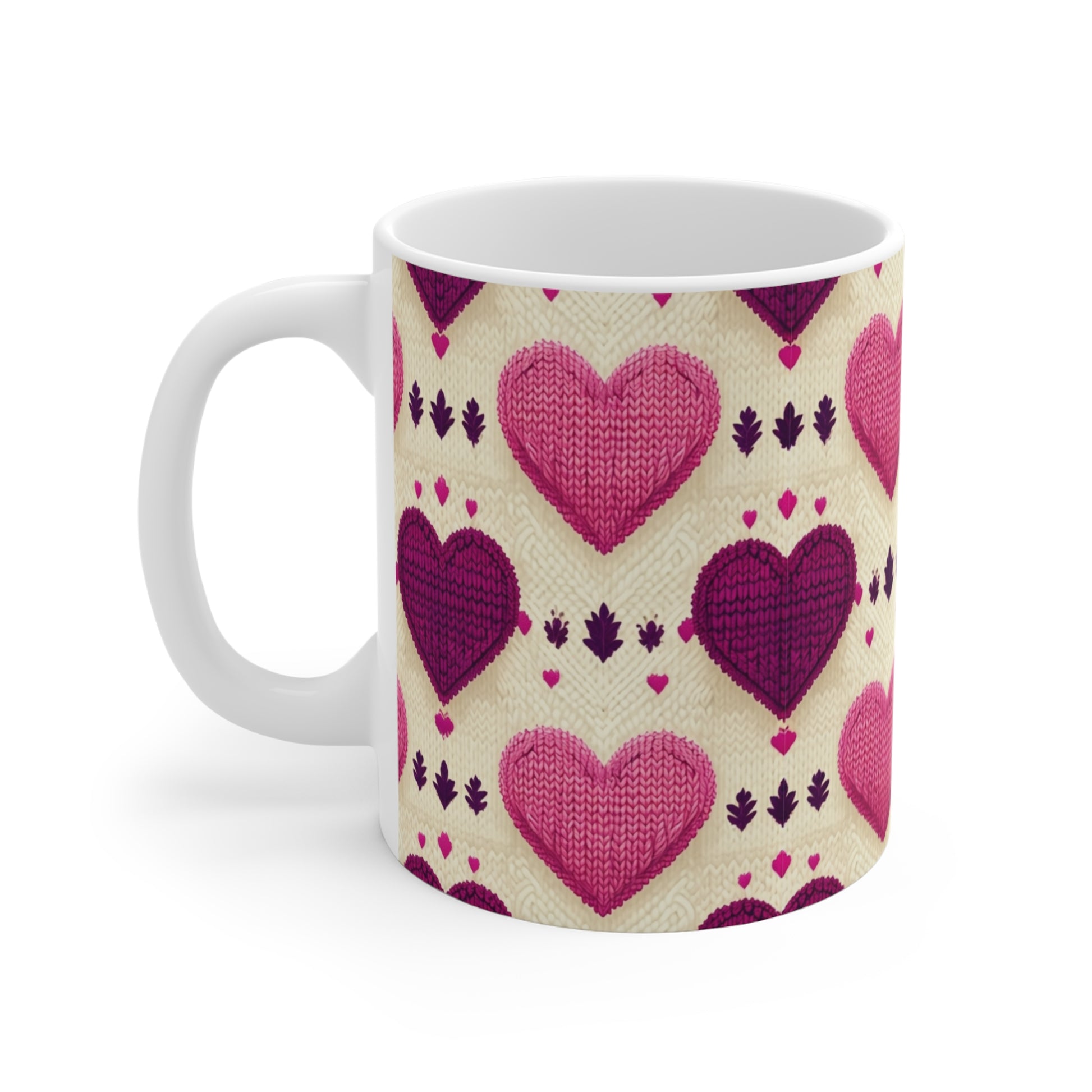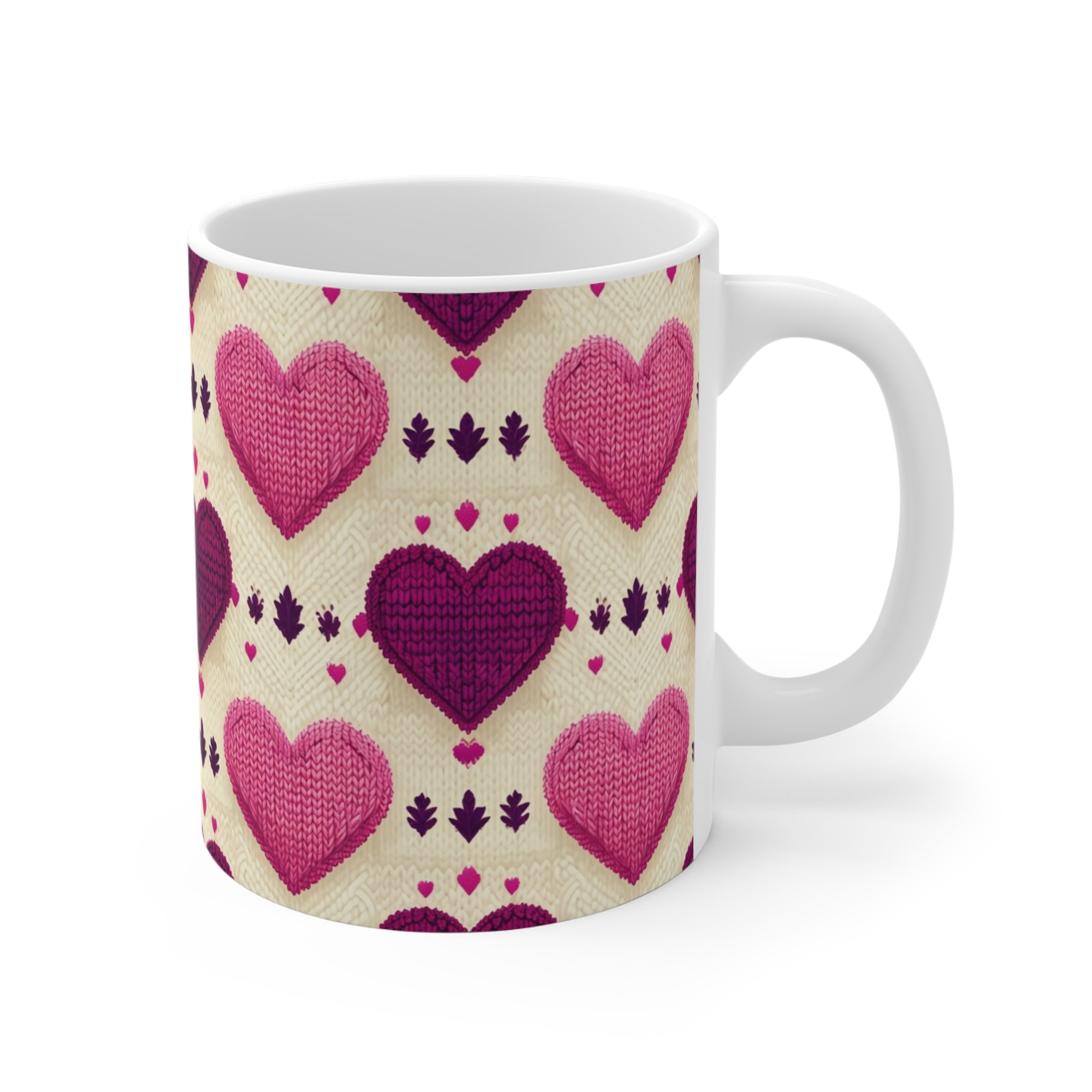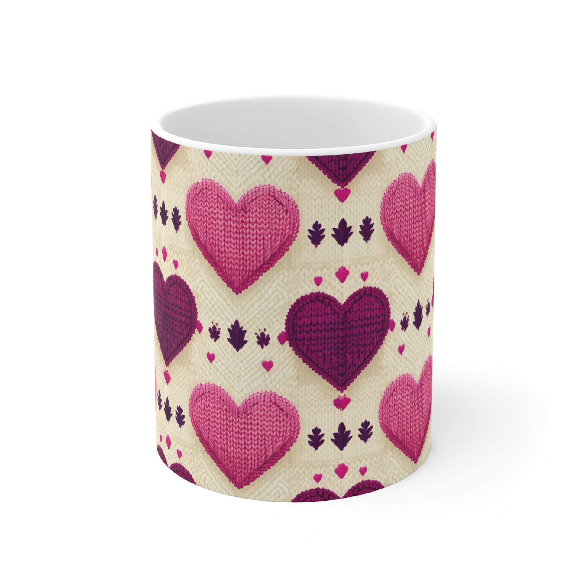 Transform your beverage experience with this charming 11 oz ceramic mug featuring a delightful knitted heart pattern design. Perfect for Valentine's Day or any occasion that calls for a touch of romance, this mug showcases alternating pink and purple hearts against a cream background, creating a cozy sweater-like aesthetic. The durable white ceramic construction with rounded corners and comfortable C-handle makes it ideal for daily use with your favorite hot beverages, from morning coffee to evening tea. The high-quality sublimation printing ensures the beautiful pattern maintains its vibrant appearance through regular use. Lead and BPA-free construction provides peace of mind with every sip. This versatile mug makes a heartwarming gift for anyone who appreciates both style and functionality in their drinkware. Whether filled with coffee, tea, or hot chocolate, this mug brings warmth to both hands and hearts.