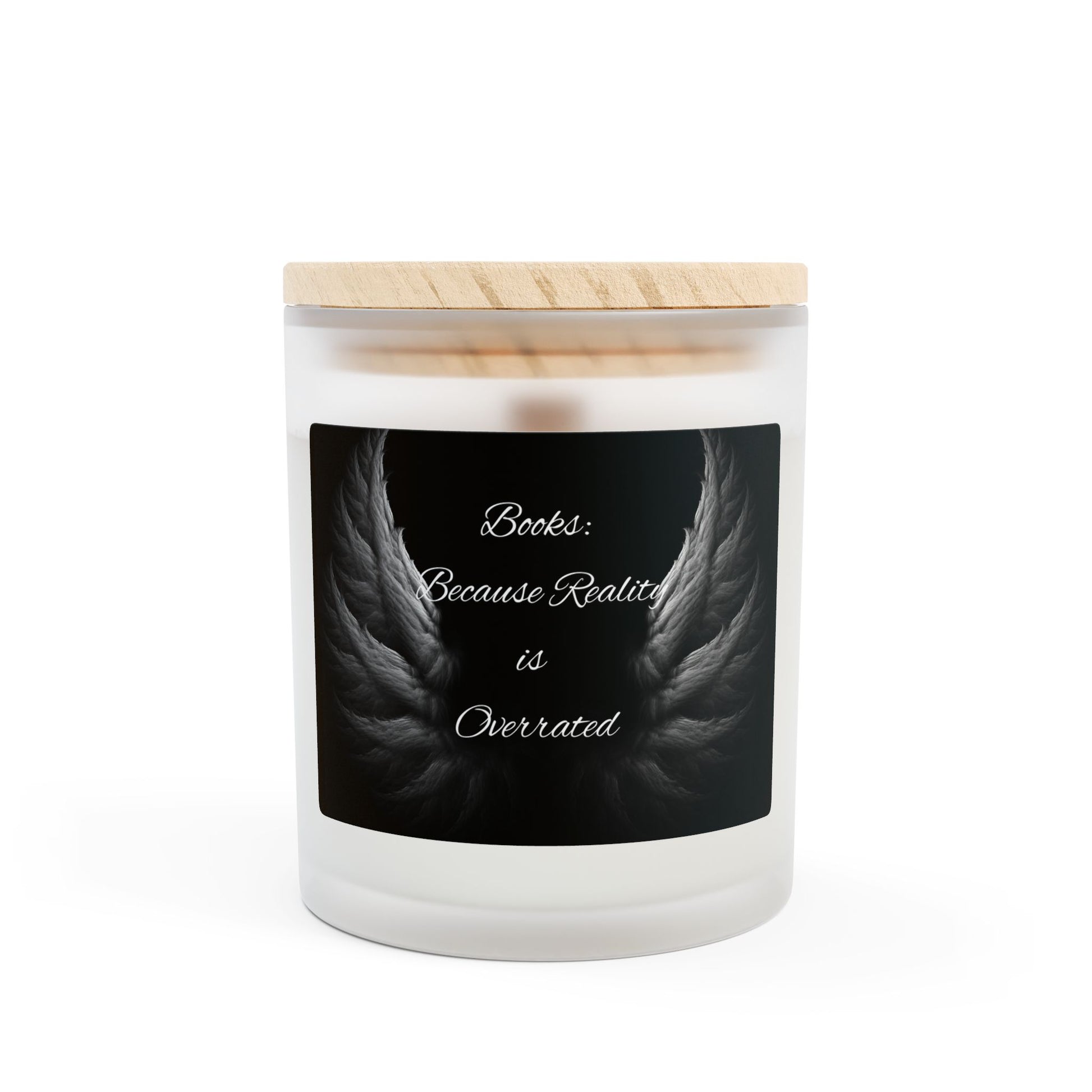 Inspirational Frosted Glass Candle with Bamboo Lid - "Books: Because Reality is Overrated" (Candle Match Books) - Perfect Gift for Book Lovers