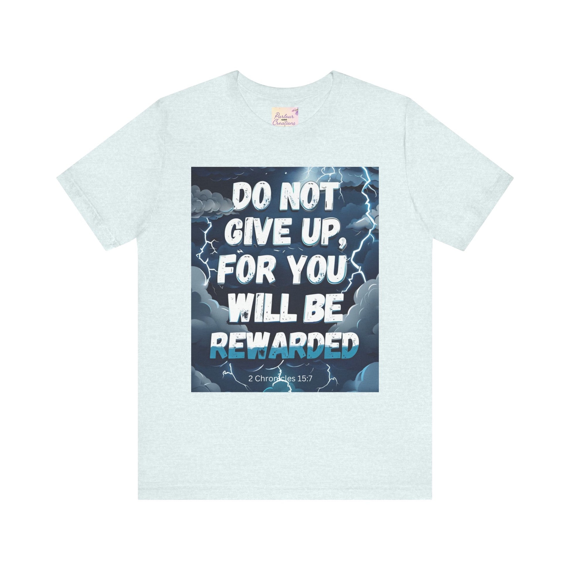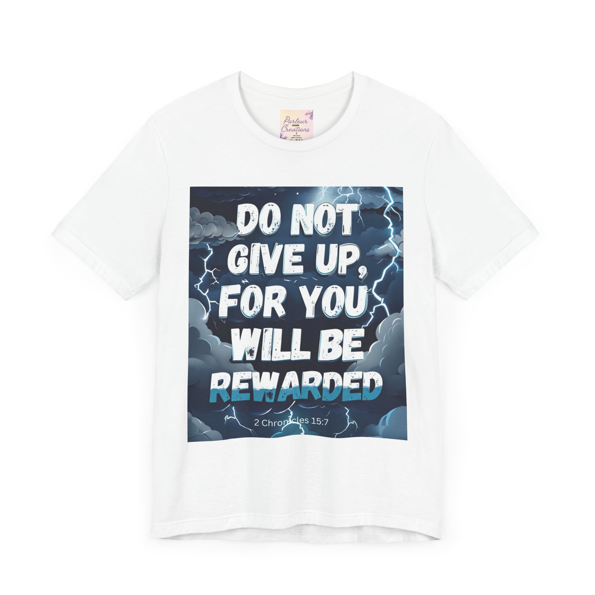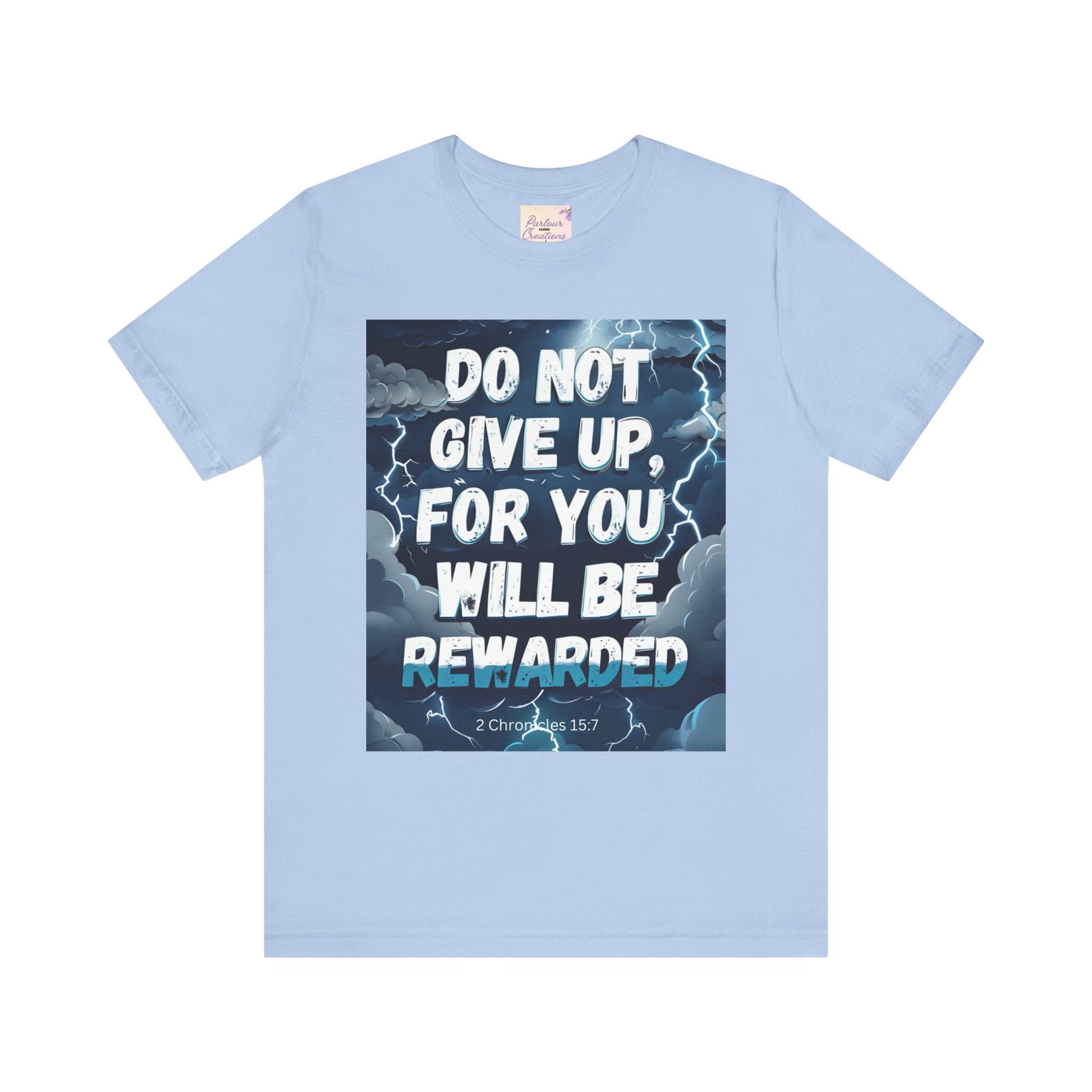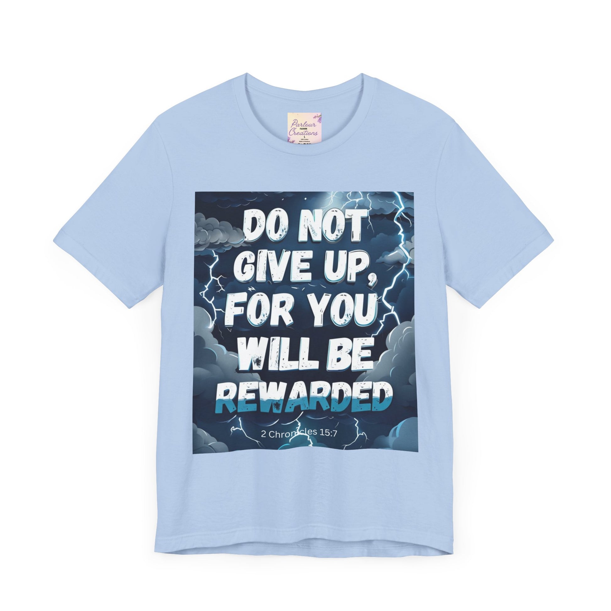 An inspirational unisex T-Shirt featuring the message 'Do not Give Up' in a storm design. This tee is perfect for those seeking motivation and faith. It is a great gift for both men and women, ideal for casual wear or for layering in various settings. Relevant for holidays, celebrations, and occasions that require a message of hope.