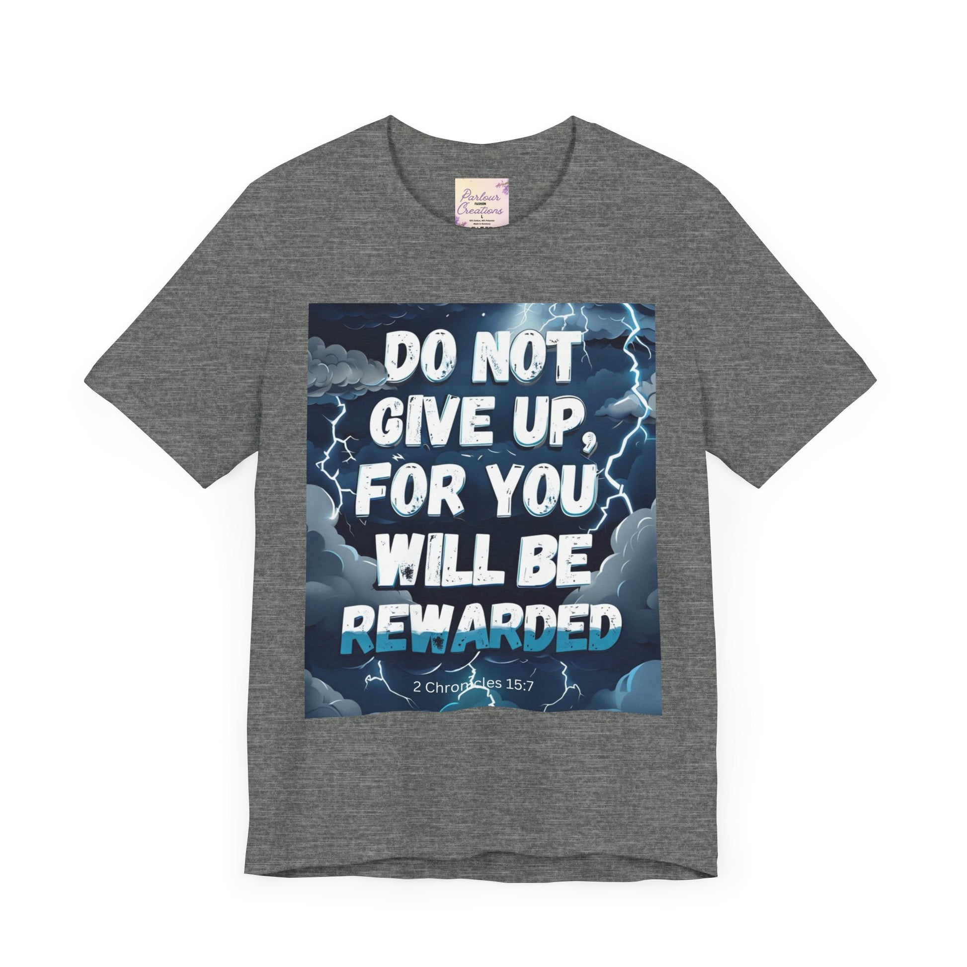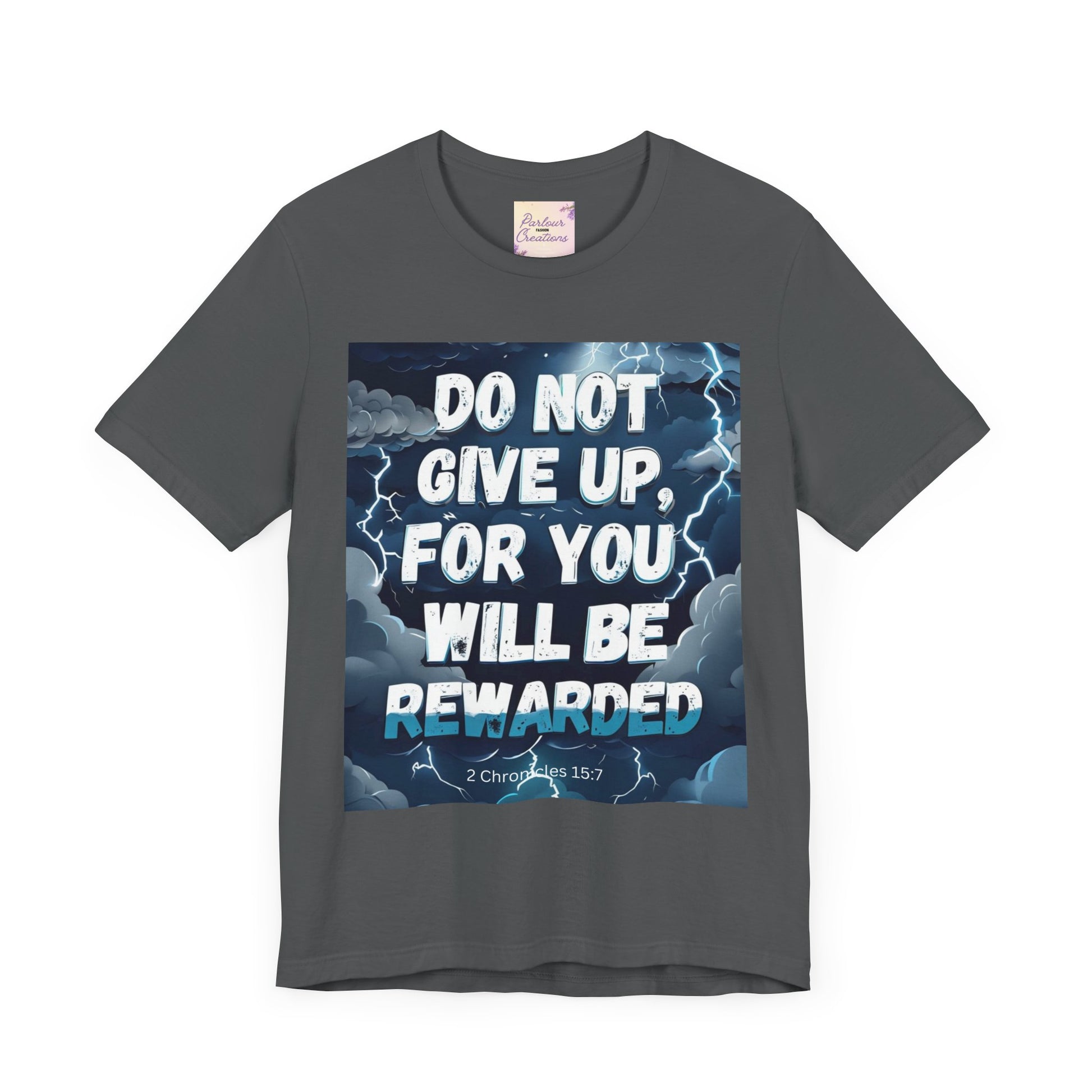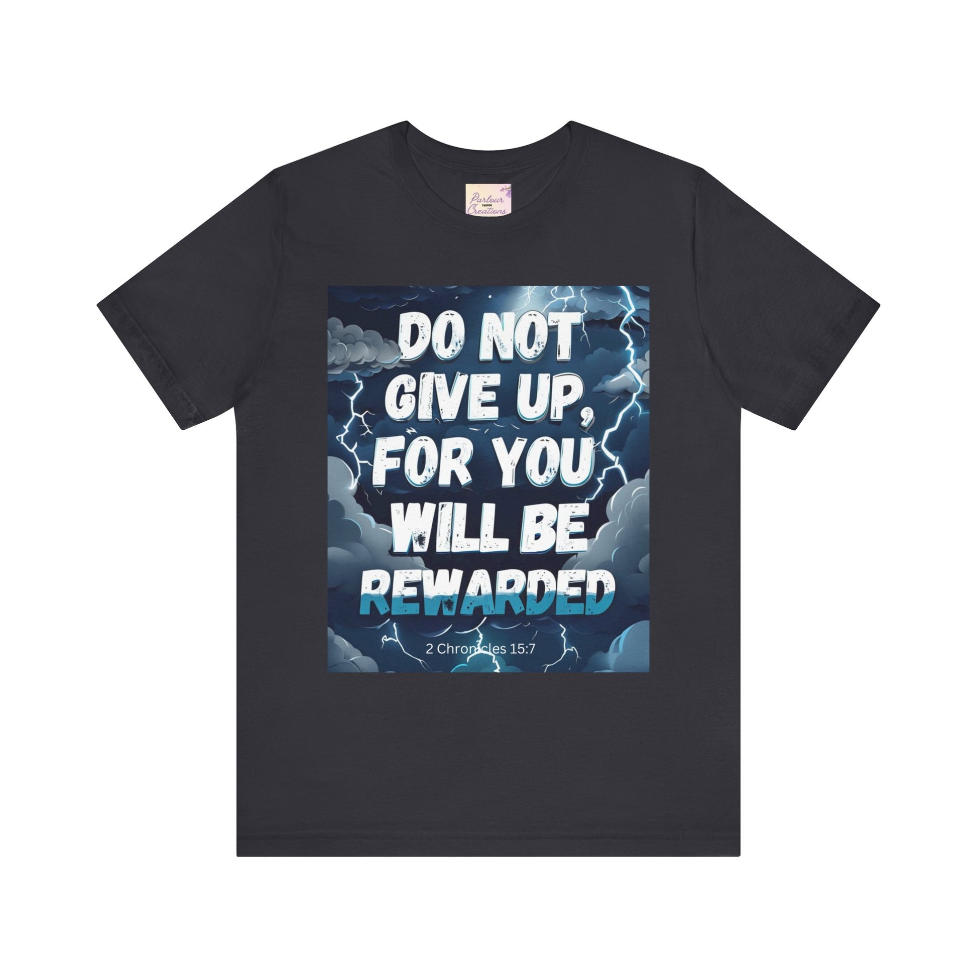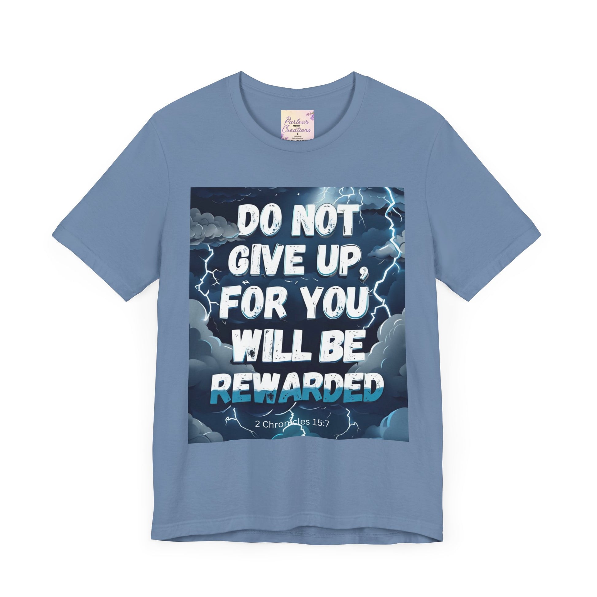 An inspirational unisex T-Shirt featuring the message 'Do not Give Up' in a storm design. This tee is perfect for those seeking motivation and faith. It is a great gift for both men and women, ideal for casual wear or for layering in various settings. Relevant for holidays, celebrations, and occasions that require a message of hope.