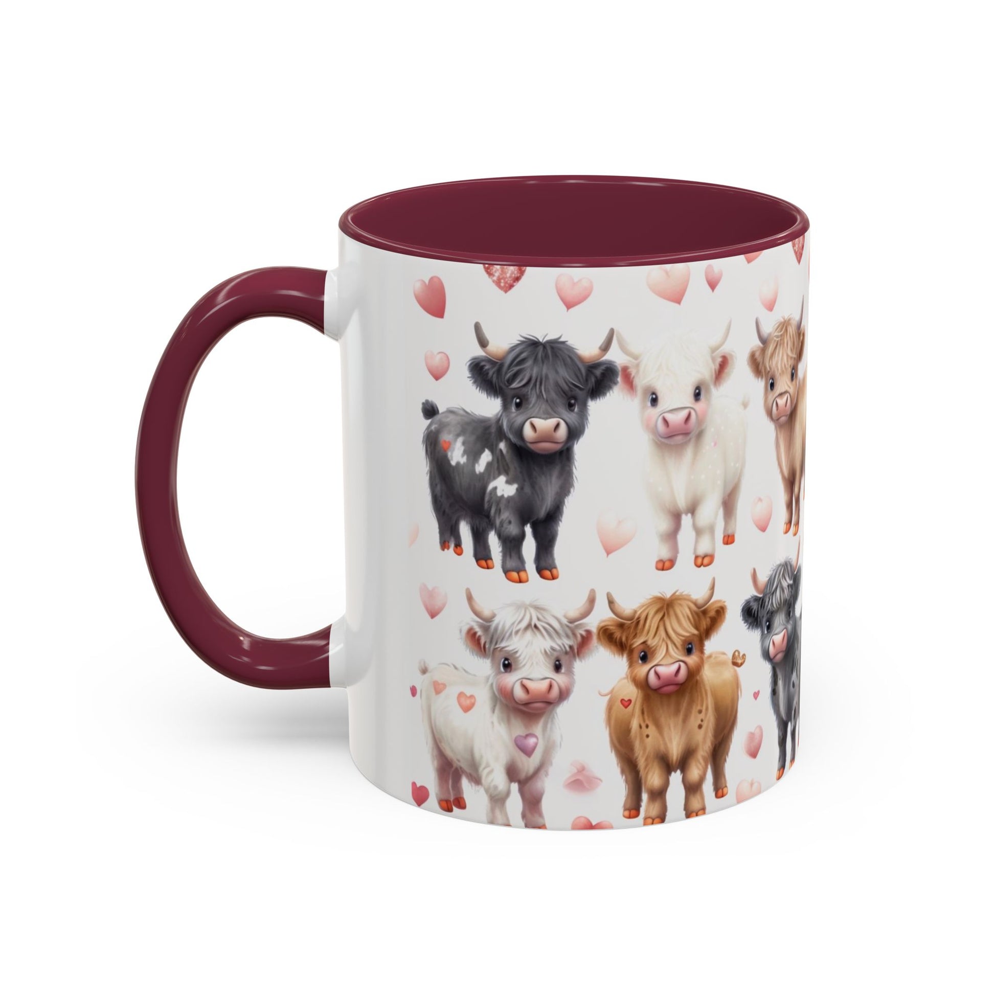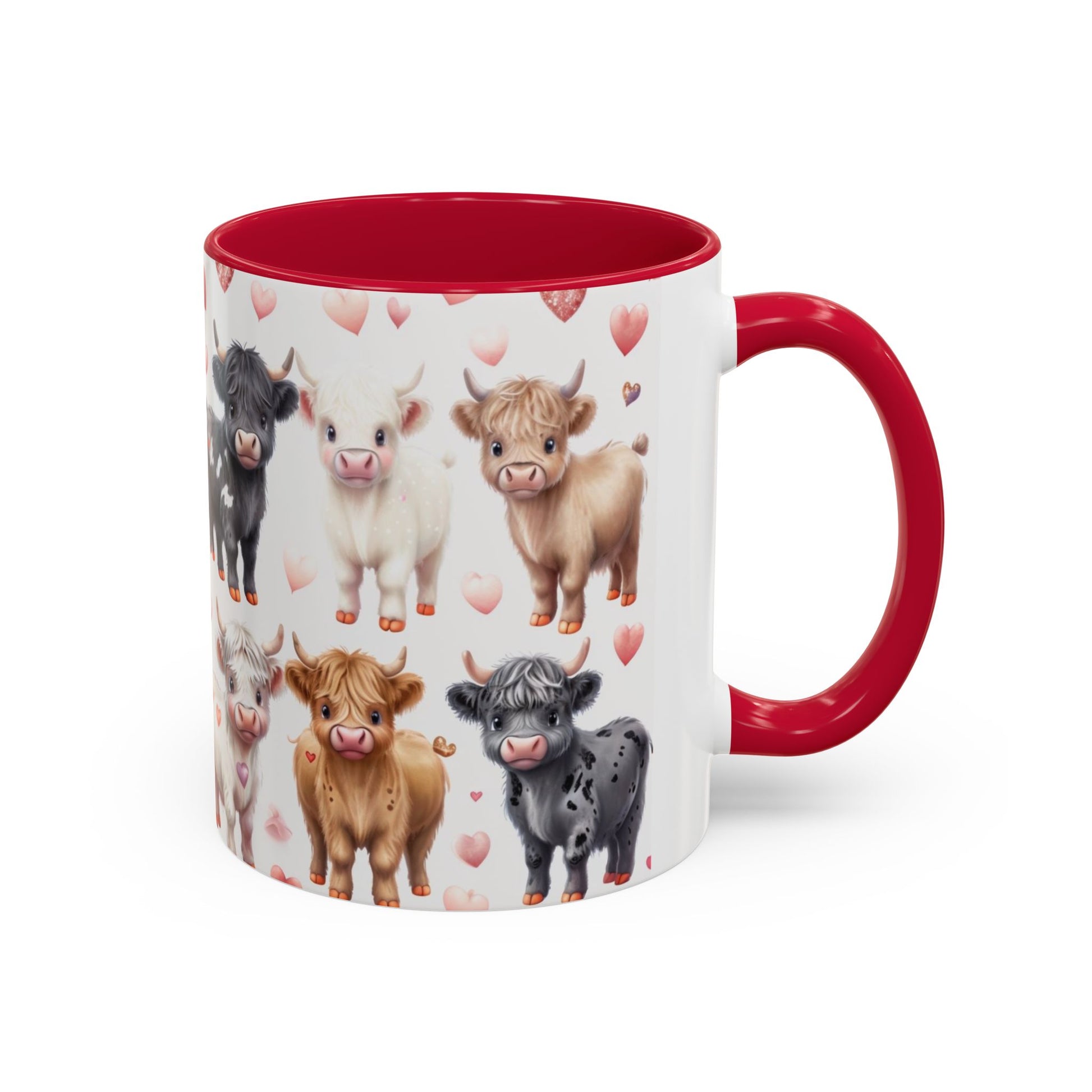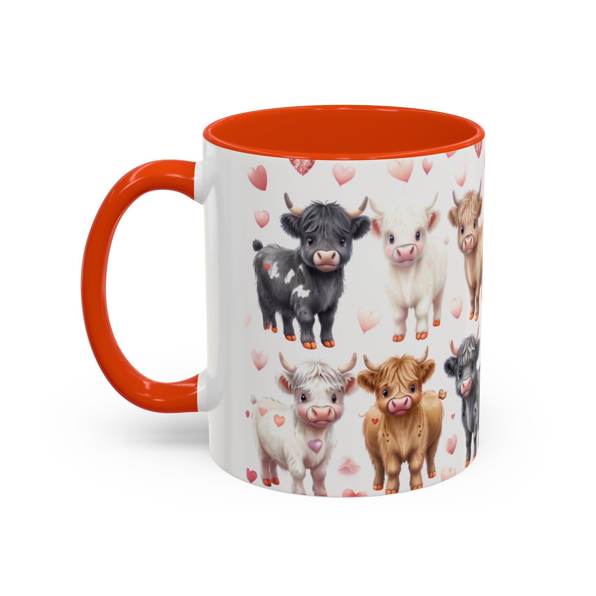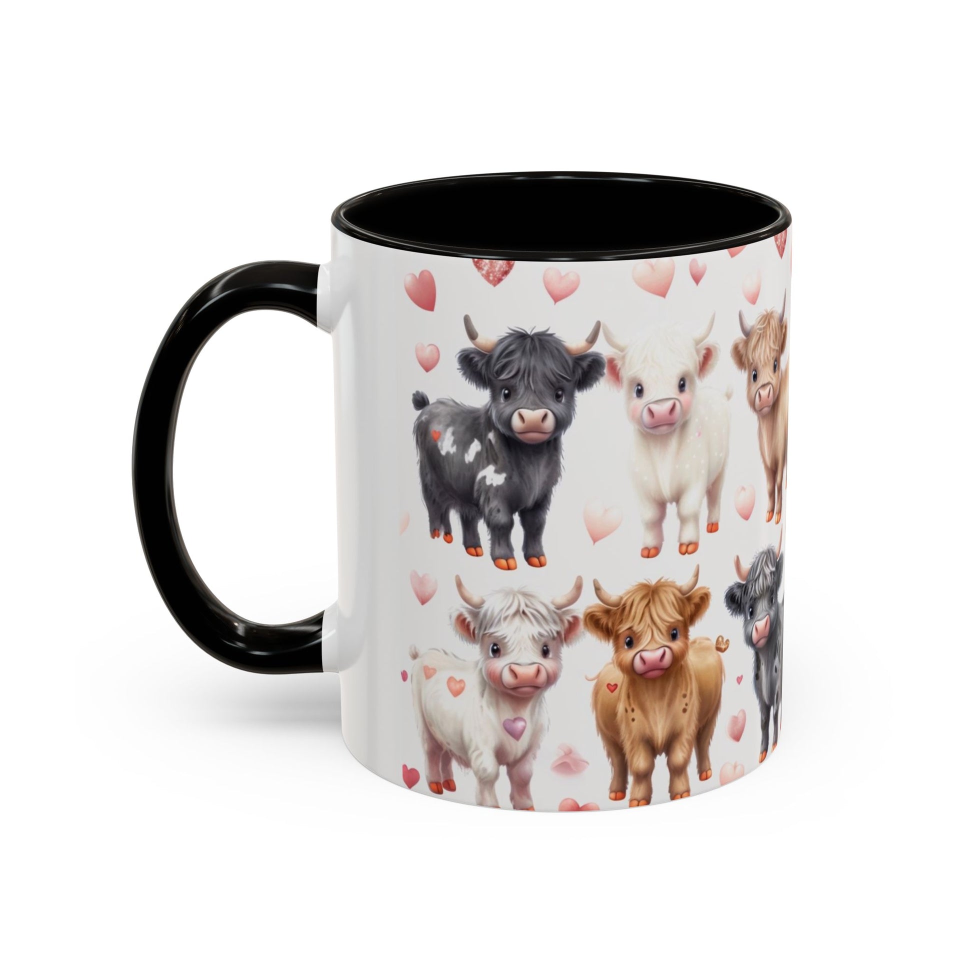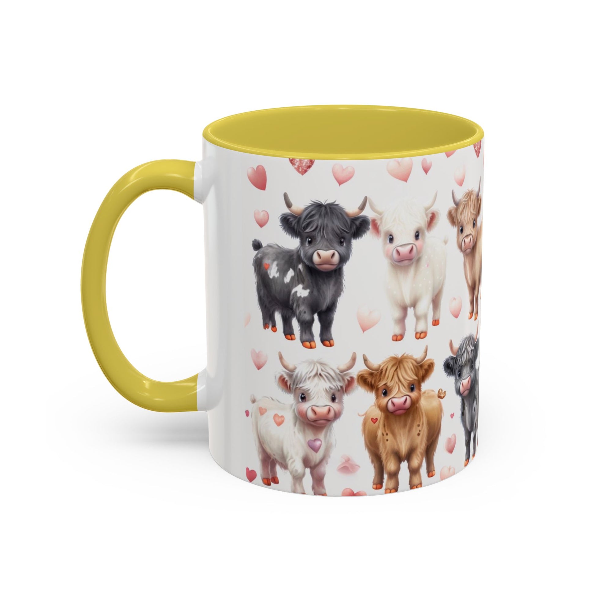 Add a delightful touch of farmhouse charm to your morning routine with this charming mini highland cow valentine-themed ceramic mug. Featuring an array of beautifully illustrated cows in various colors, scattered among adorable heart motifs on a pristine white background. The mug comes with your choice of 12 vibrant accent colors for the handle and interior, adding a personalized pop to your daily brew. Available in two generous sizes - 11 oz for your standard cup of coffee for those mornings when you need an extra boost. The glossy ceramic construction feels substantial in your hands, while the ergonomic C-shaped handle ensures a comfortable grip. The high-fidelity artwork maintains its crisp detail and vivid colors through countless dishwasher cycles, making this mug both practical and decorative. Perfect for chicken enthusiasts, farm lovers, or anyone who appreciates whimsical kitchen accessories that bring a smile to their face.