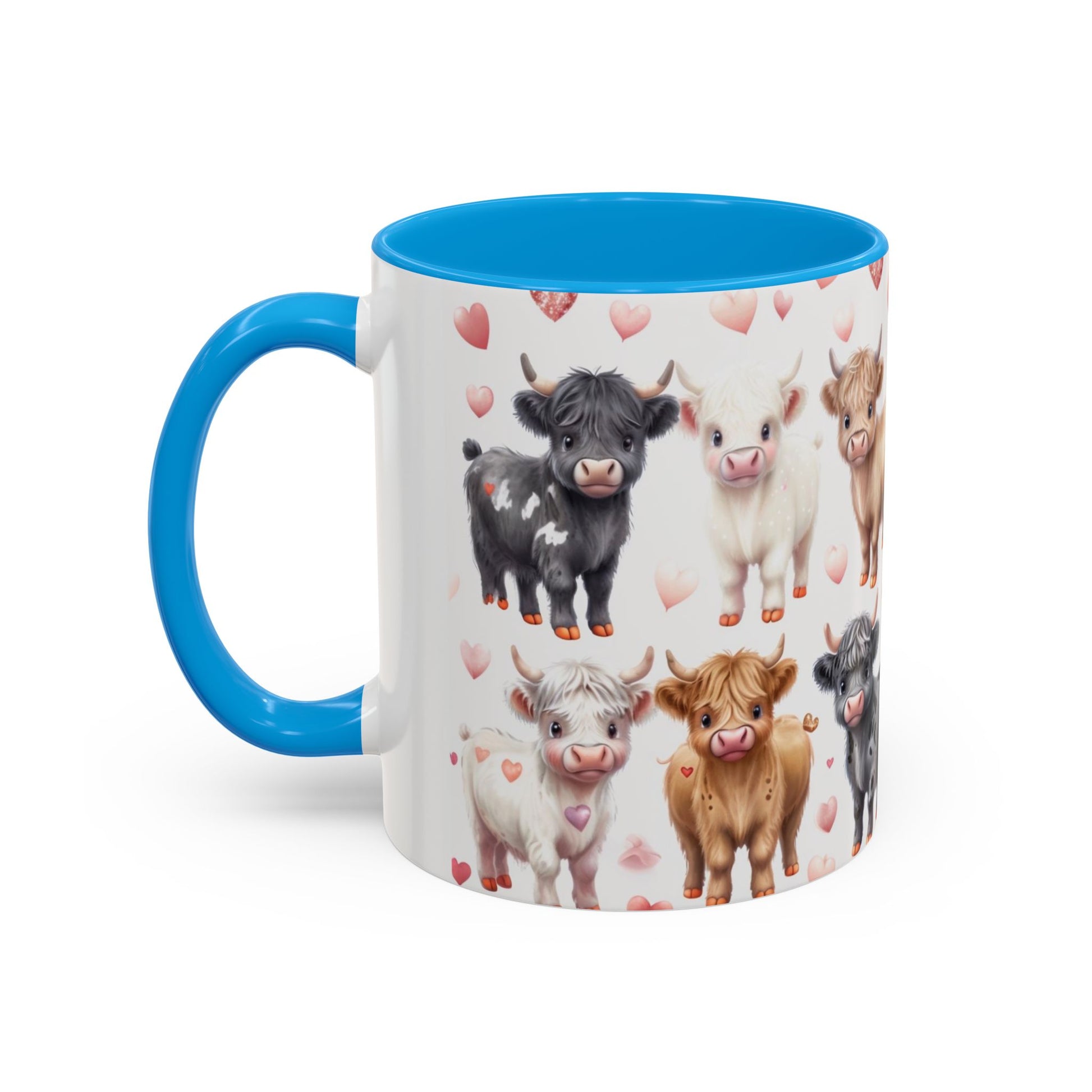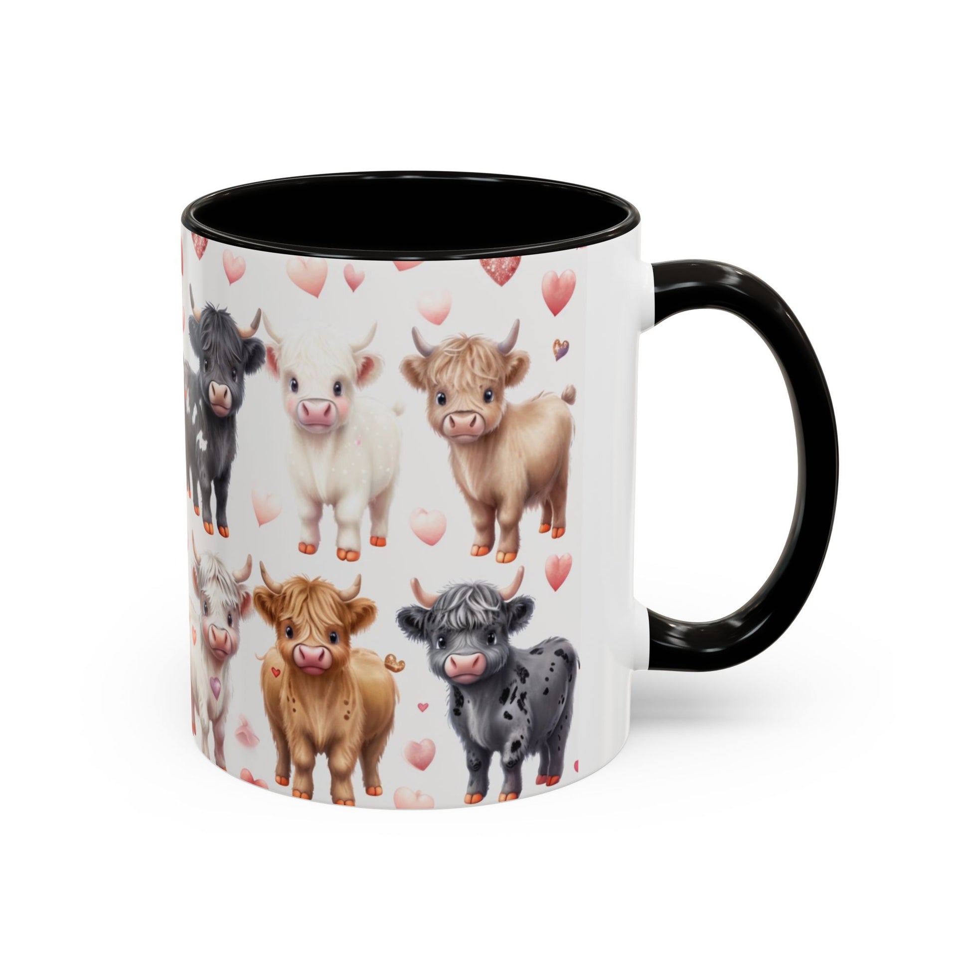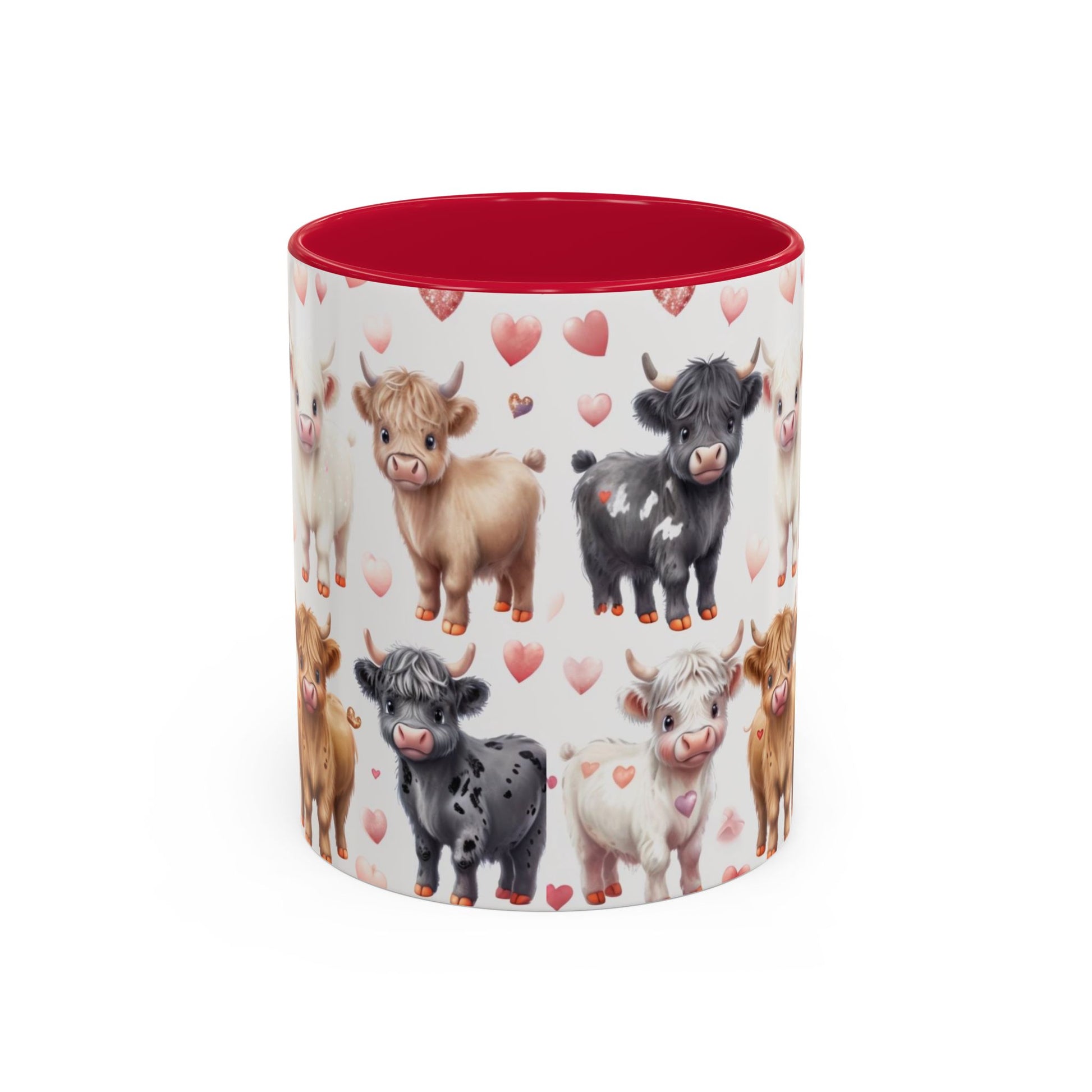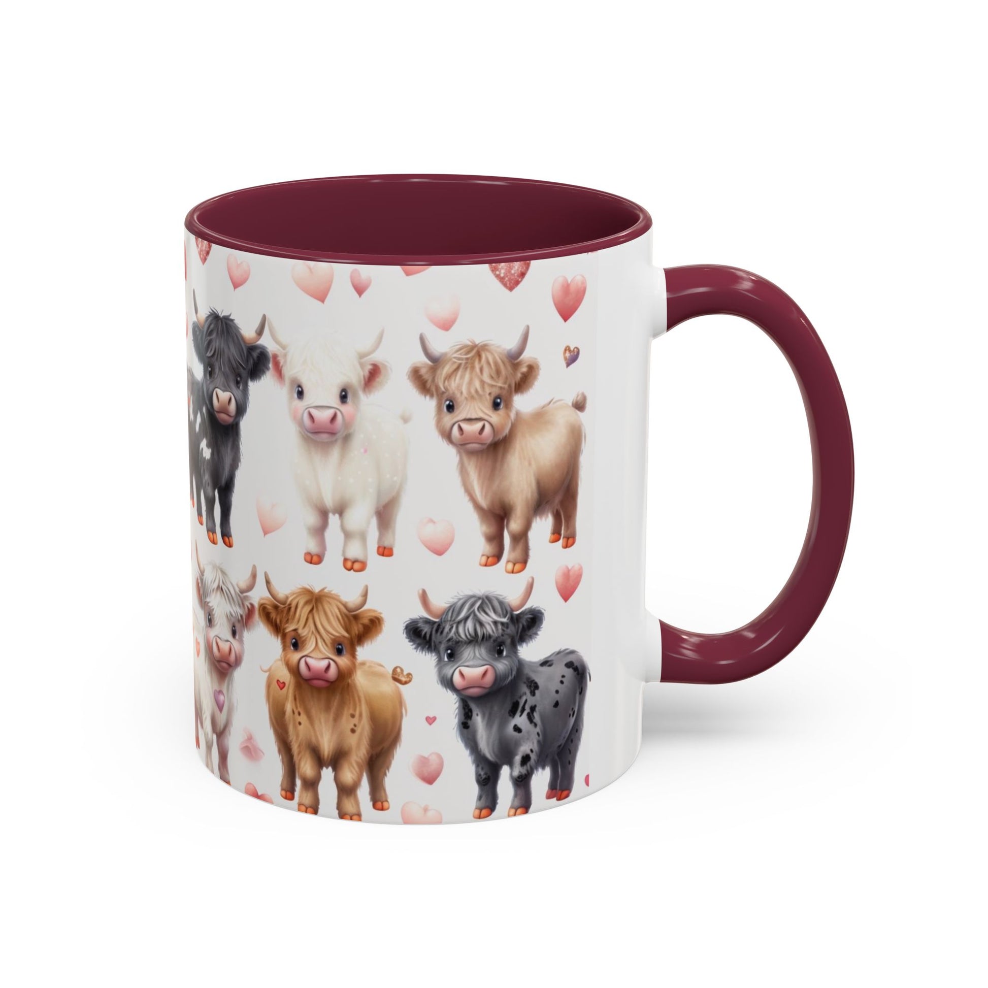 Add a delightful touch of farmhouse charm to your morning routine with this charming mini highland cow valentine-themed ceramic mug. Featuring an array of beautifully illustrated cows in various colors, scattered among adorable heart motifs on a pristine white background. The mug comes with your choice of 12 vibrant accent colors for the handle and interior, adding a personalized pop to your daily brew. Available in two generous sizes - 11 oz for your standard cup of coffee for those mornings when you need an extra boost. The glossy ceramic construction feels substantial in your hands, while the ergonomic C-shaped handle ensures a comfortable grip. The high-fidelity artwork maintains its crisp detail and vivid colors through countless dishwasher cycles, making this mug both practical and decorative. Perfect for chicken enthusiasts, farm lovers, or anyone who appreciates whimsical kitchen accessories that bring a smile to their face.