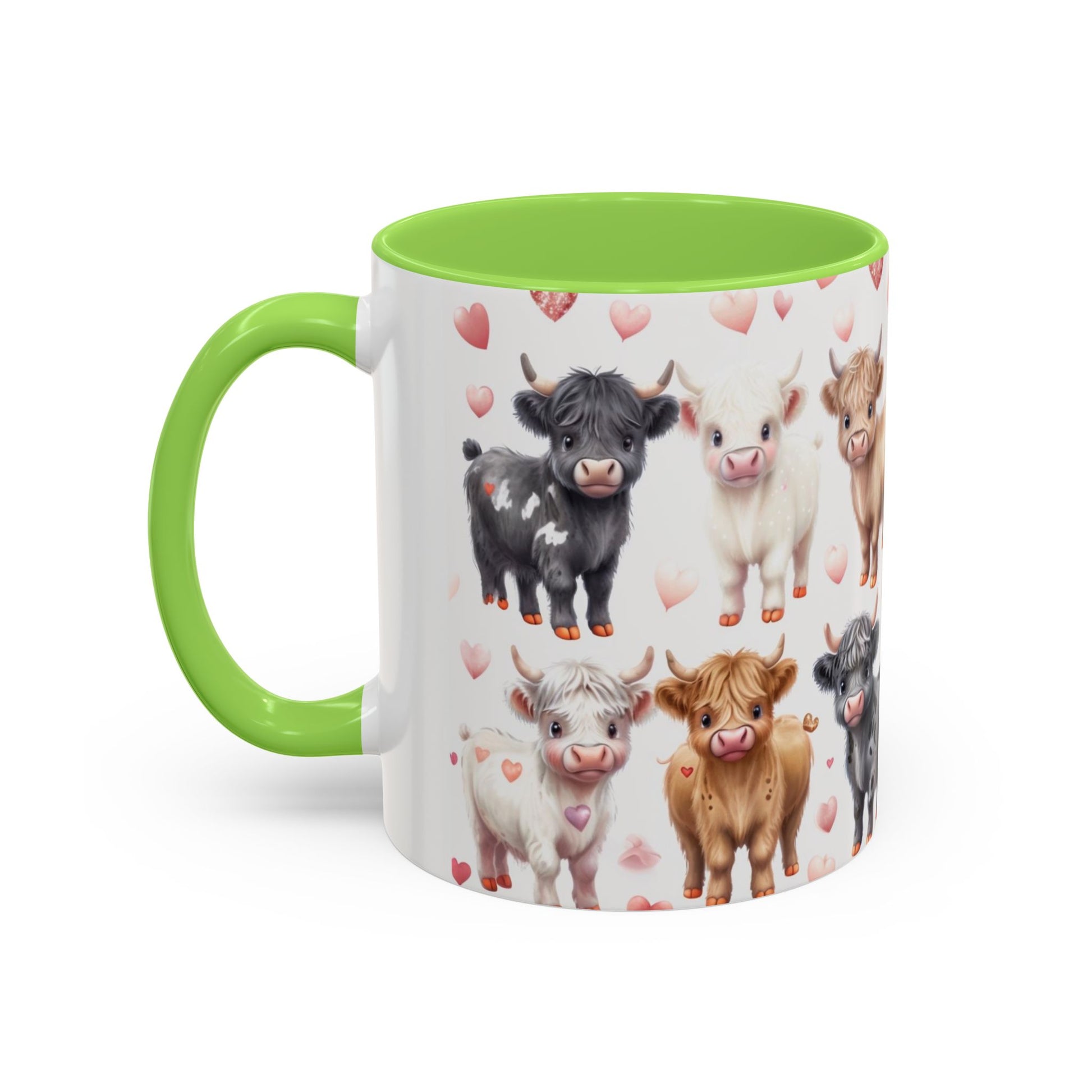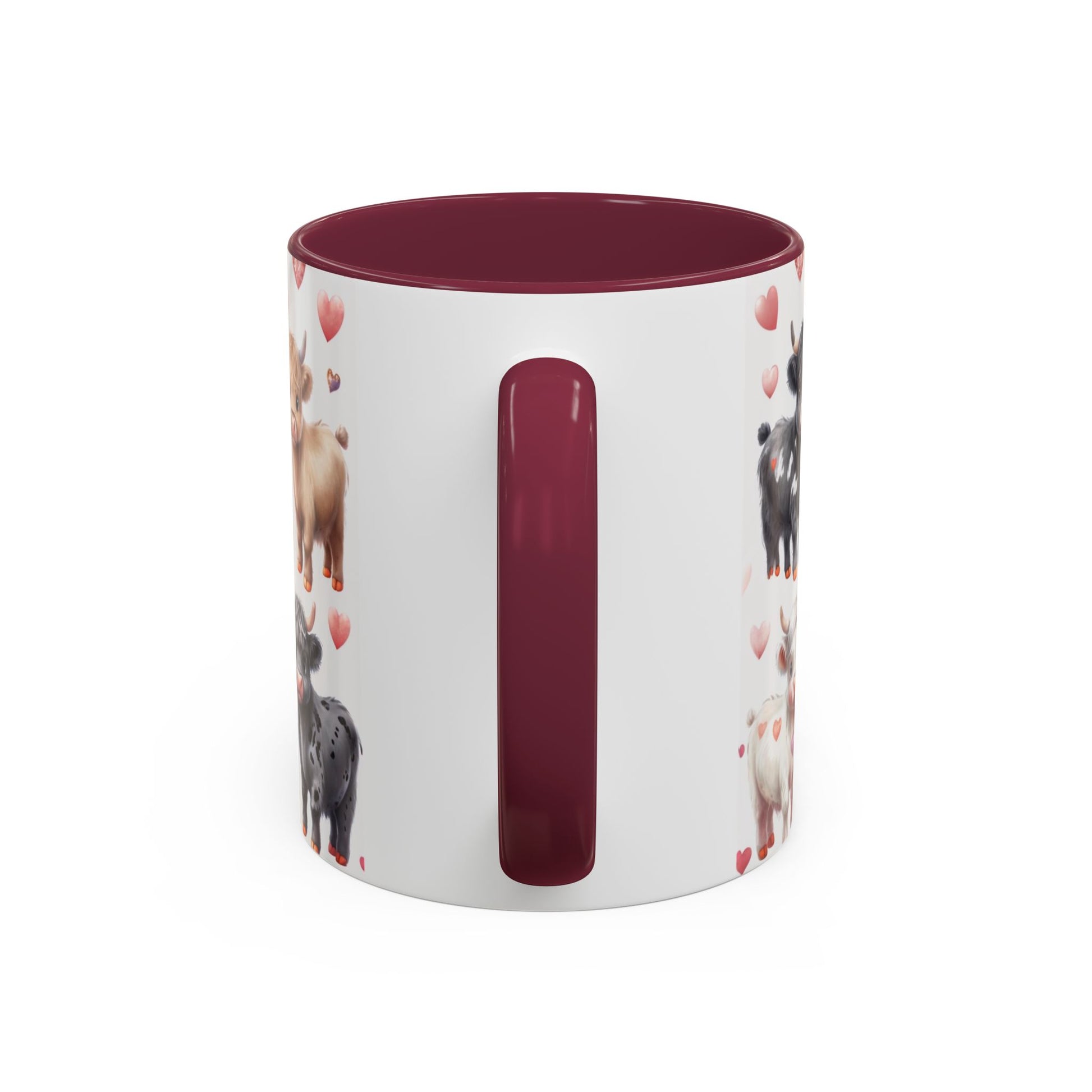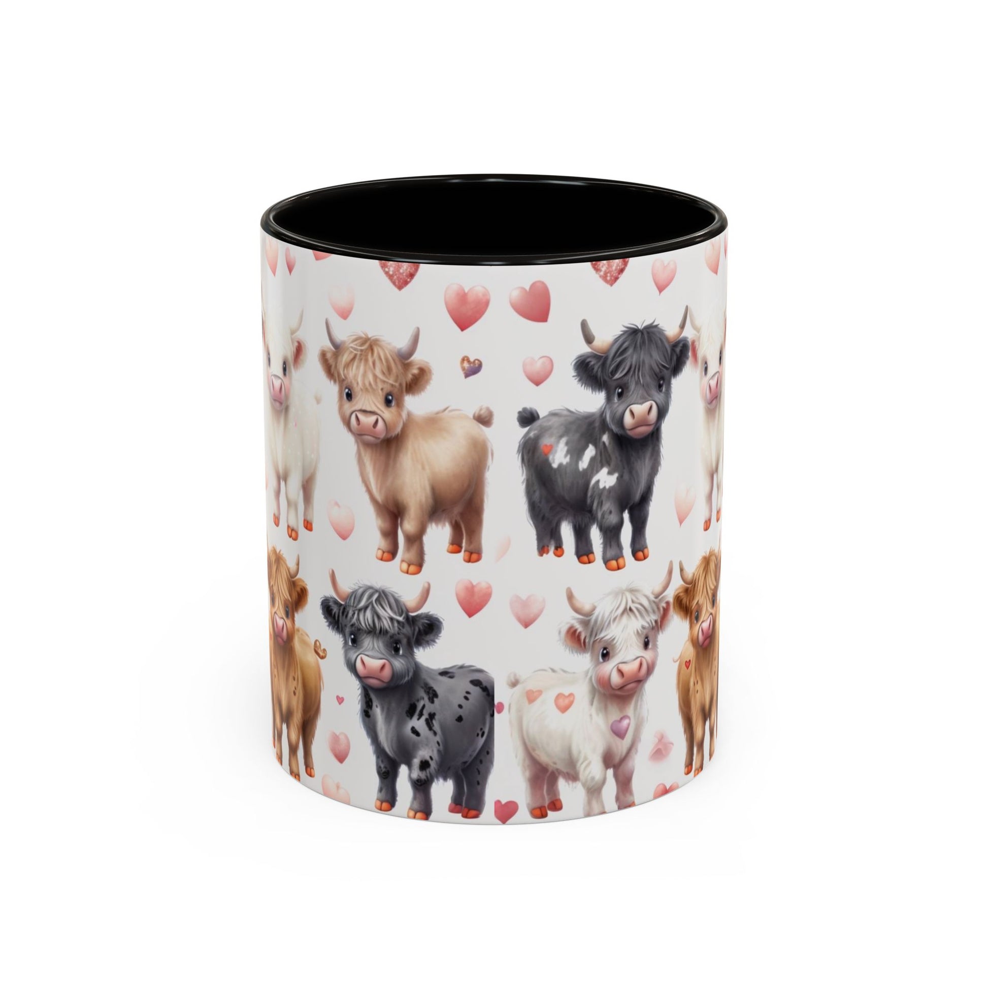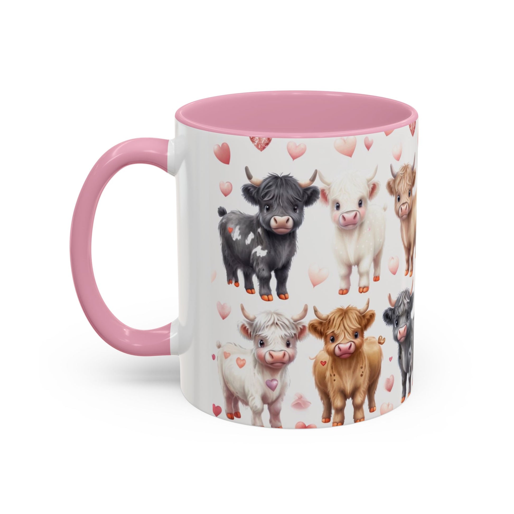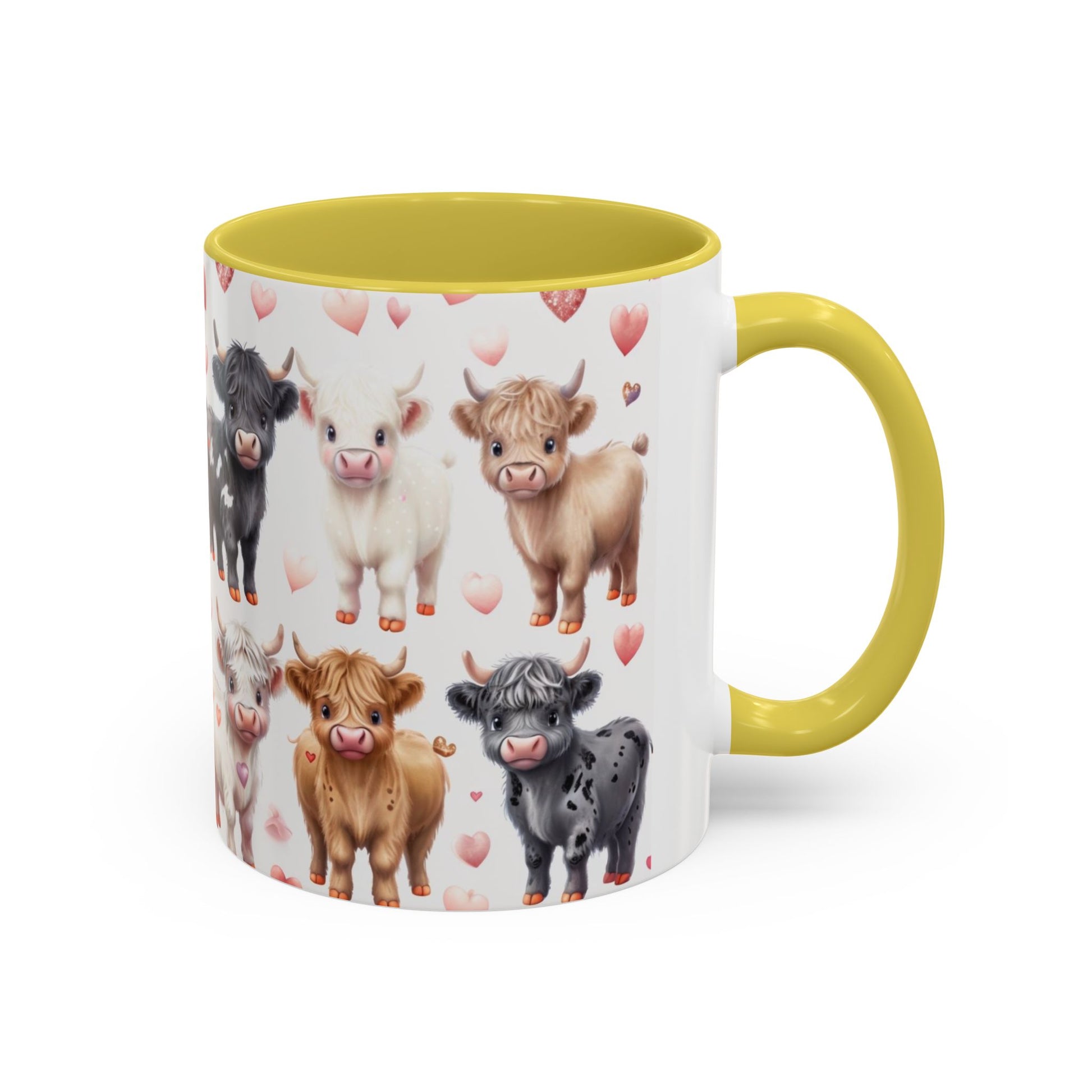 Add a delightful touch of farmhouse charm to your morning routine with this charming mini highland cow valentine-themed ceramic mug. Featuring an array of beautifully illustrated cows in various colors, scattered among adorable heart motifs on a pristine white background. The mug comes with your choice of 12 vibrant accent colors for the handle and interior, adding a personalized pop to your daily brew. Available in two generous sizes - 11 oz for your standard cup of coffee for those mornings when you need an extra boost. The glossy ceramic construction feels substantial in your hands, while the ergonomic C-shaped handle ensures a comfortable grip. The high-fidelity artwork maintains its crisp detail and vivid colors through countless dishwasher cycles, making this mug both practical and decorative. Perfect for chicken enthusiasts, farm lovers, or anyone who appreciates whimsical kitchen accessories that bring a smile to their face.