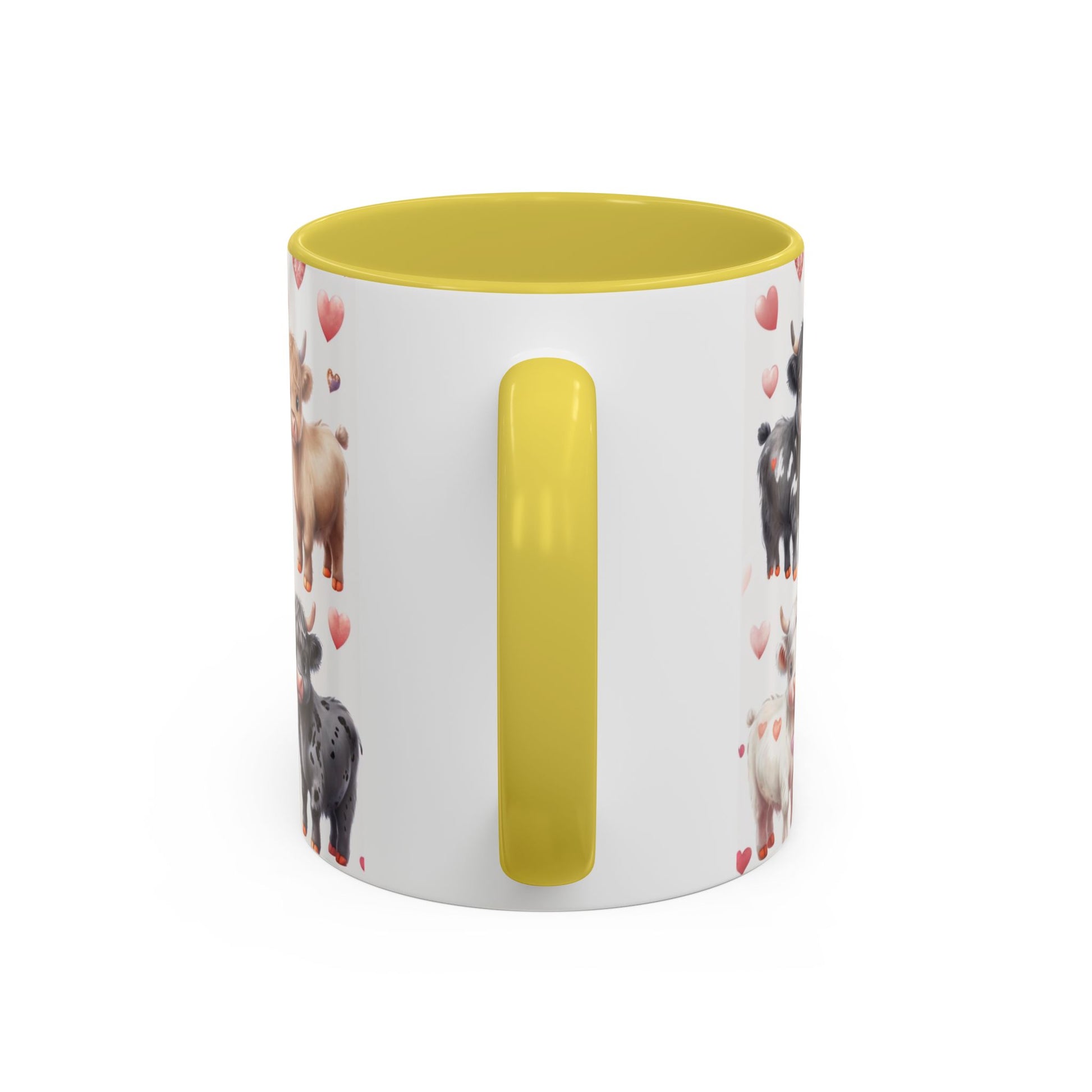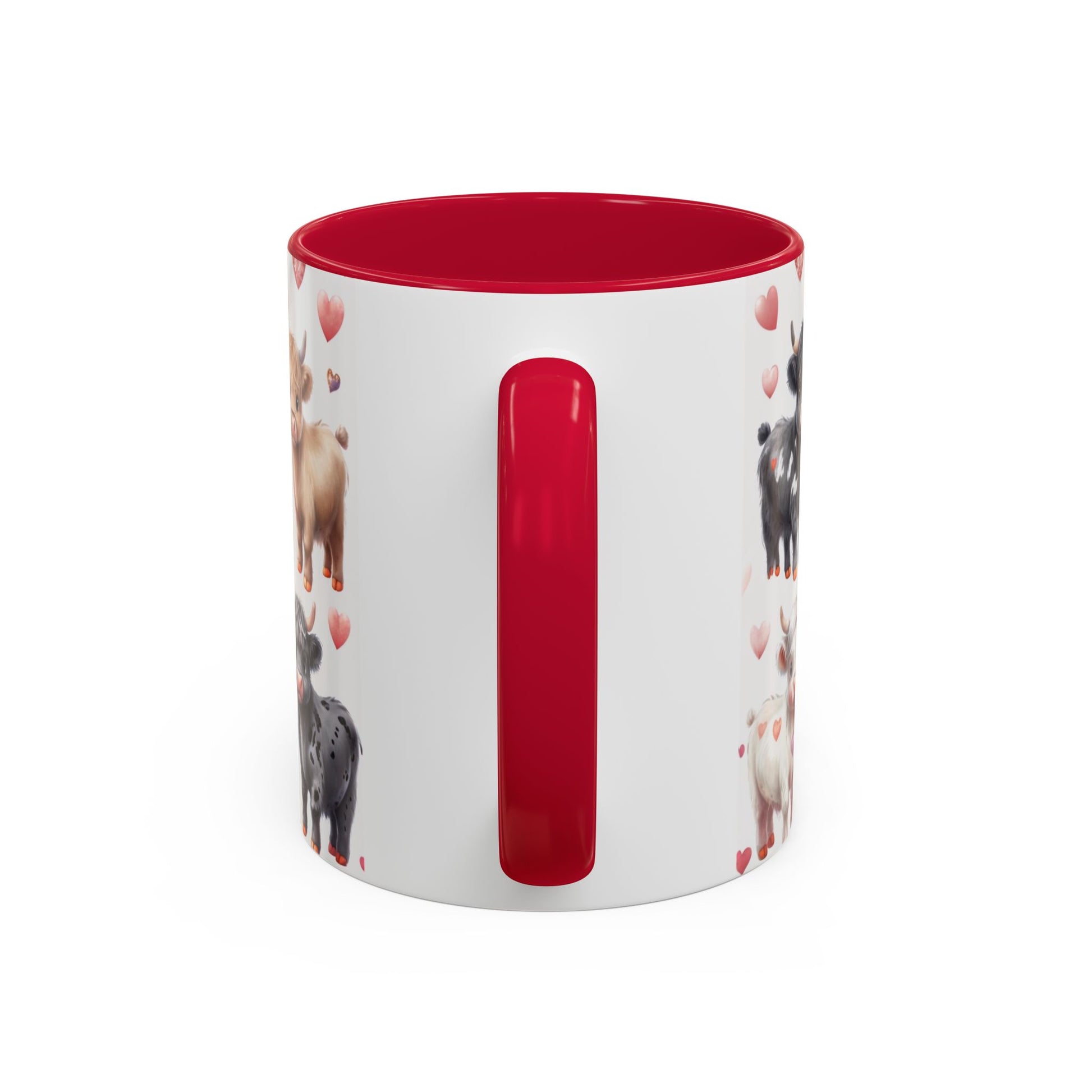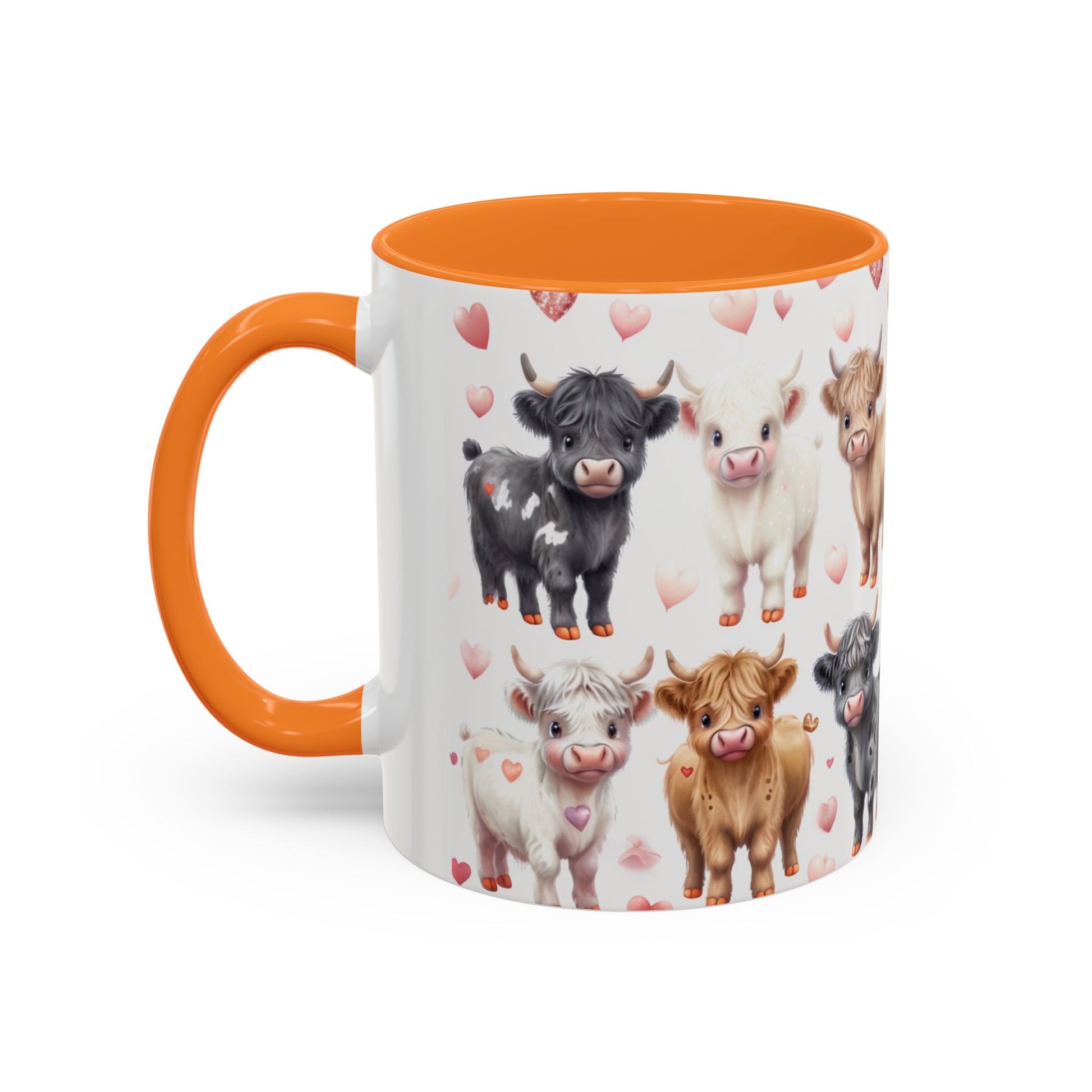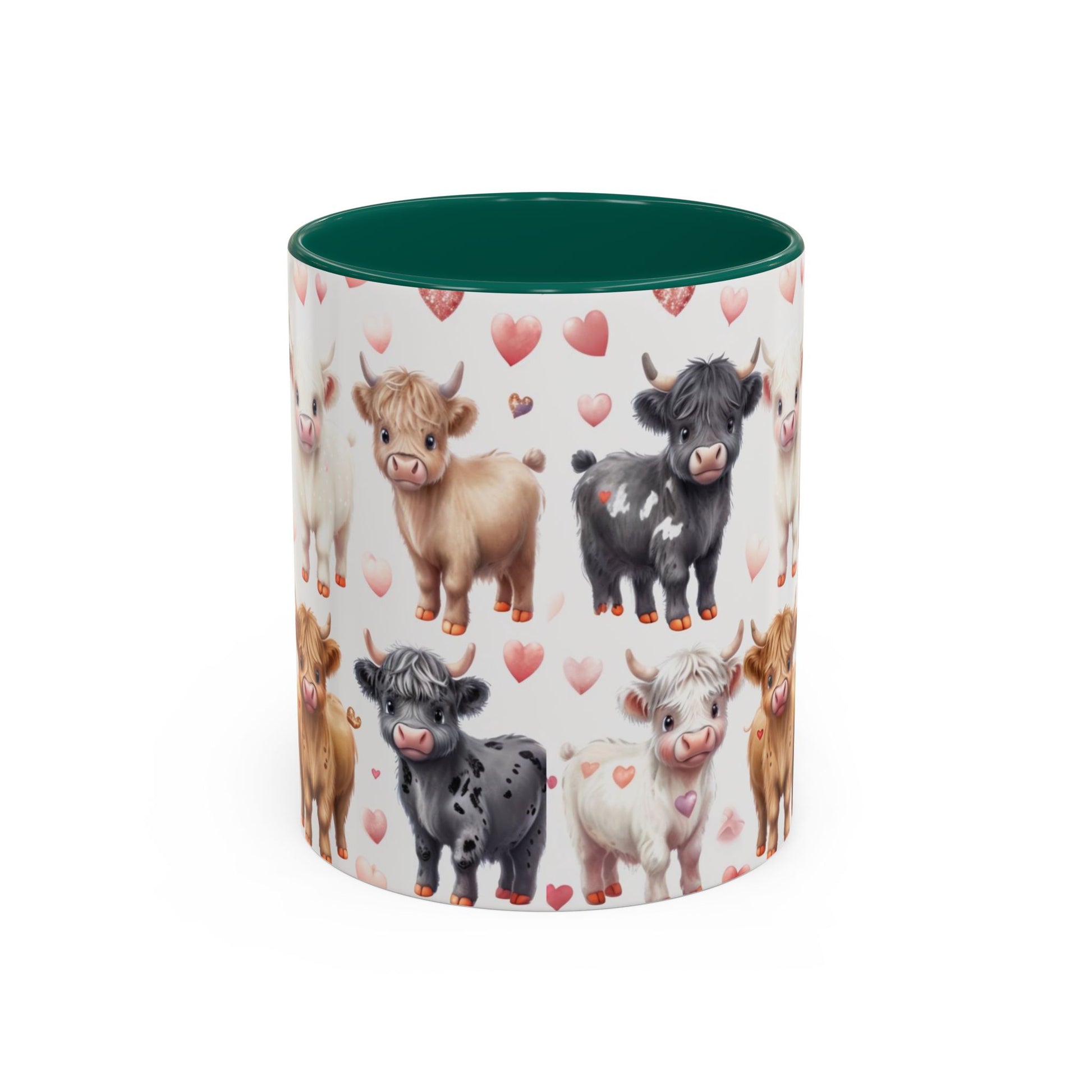 Add a delightful touch of farmhouse charm to your morning routine with this charming mini highland cow valentine-themed ceramic mug. Featuring an array of beautifully illustrated cows in various colors, scattered among adorable heart motifs on a pristine white background. The mug comes with your choice of 12 vibrant accent colors for the handle and interior, adding a personalized pop to your daily brew. Available in two generous sizes - 11 oz for your standard cup of coffee for those mornings when you need an extra boost. The glossy ceramic construction feels substantial in your hands, while the ergonomic C-shaped handle ensures a comfortable grip. The high-fidelity artwork maintains its crisp detail and vivid colors through countless dishwasher cycles, making this mug both practical and decorative. Perfect for chicken enthusiasts, farm lovers, or anyone who appreciates whimsical kitchen accessories that bring a smile to their face.